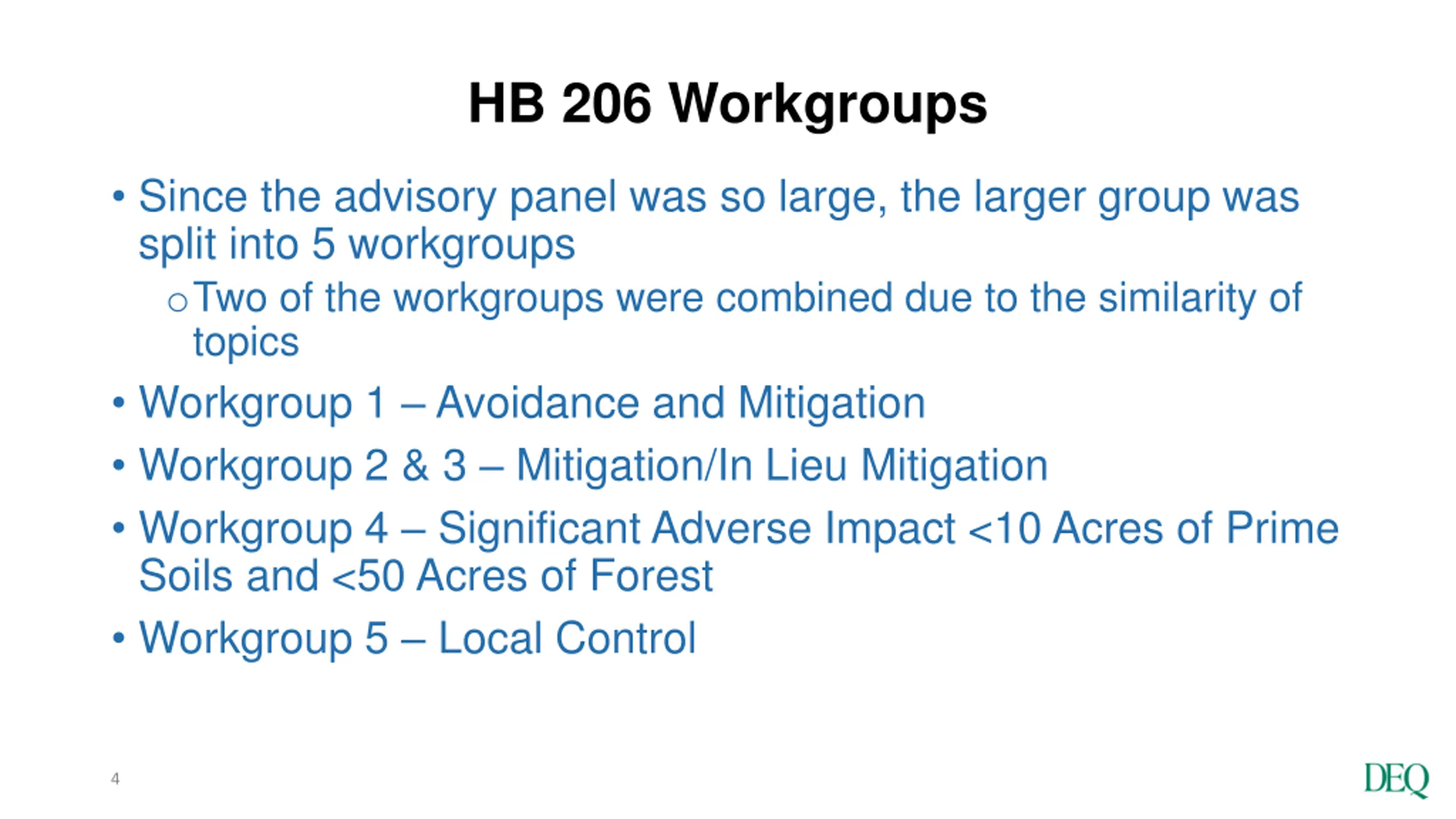 HB 206 Advisory Panel DEQ solicited an advisory panel consisting of representatives from a variety of groups as specified in HB206 The advisory panel is comprised of over 70 participants and includes environmental interests, solar developer interests, localities, representatives from multiple state agencies, and other interested parties oRepresentatives from State Agencies and State Universities were utilized as Subject Matter Experts attending all advisory panel meetings and provided expertise as requested Due to size of panel, DEQ contracted with University of Virginia s Institute of Engagement and Negotiation (IEN) to facilitate DEQ and IEN set a series of 5 meetings (3 in Richmond and 2 in Charlottesville) to develop recommendations for the report to the General Assembly 3