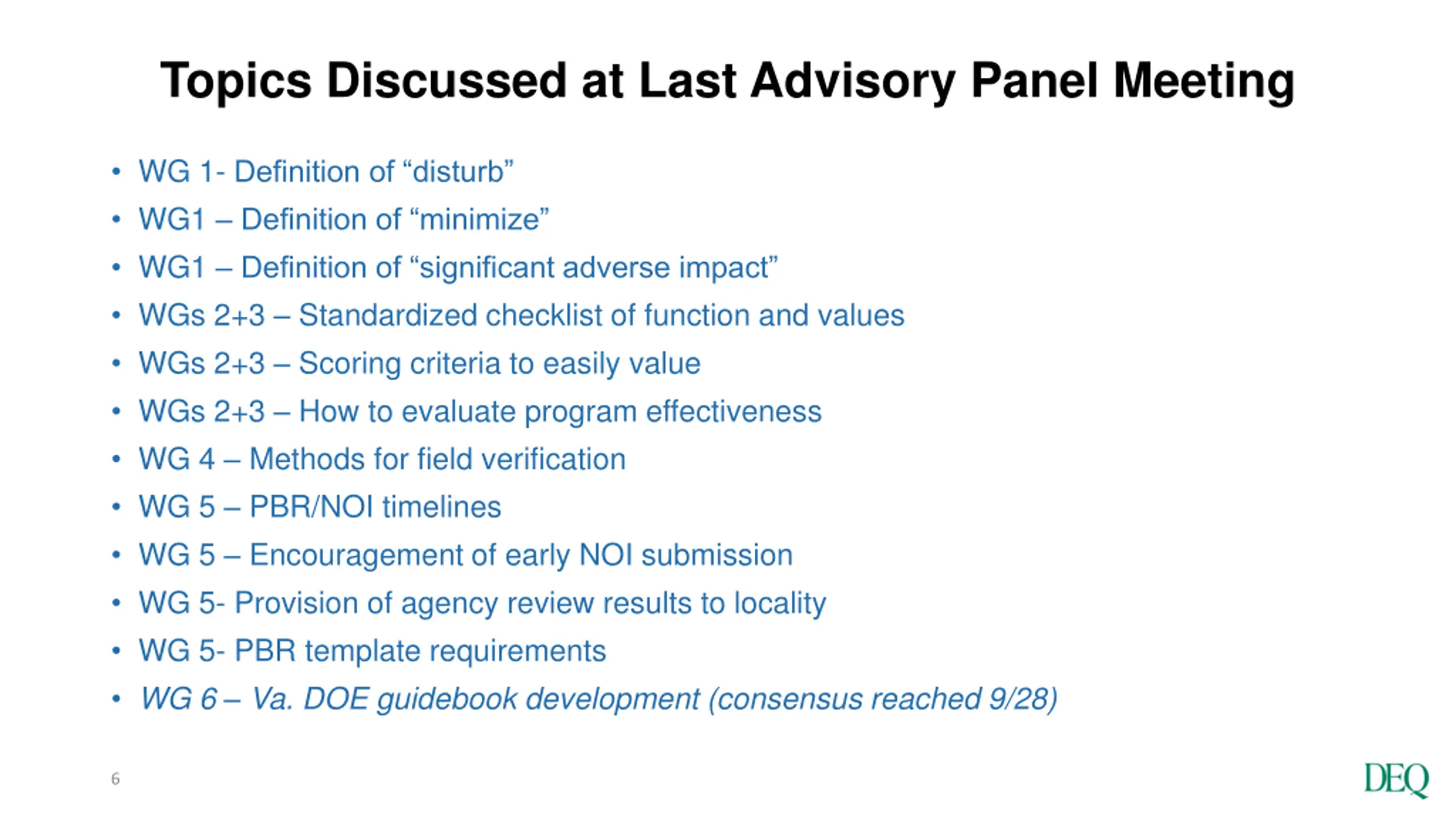 Topics Discussed at Last Advisory Panel Meeting WG 1- Definition of disturb WG1 Definition of minimize WG1 Definition of significant adverse impact WGs 2+3 Standardized checklist of function and values WGs 2+3 Scoring criteria to easily value WGs 2+3 How to evaluate program effectiveness WG 4 Methods for field verification WG 5 PBR/NOI timelines WG 5 Encouragement of early NOI submission WG 5- Provision of agency review results to locality WG 5- PBR template requirements WG 6 Va. DOE guidebook development (consensus reached 9/28) 6