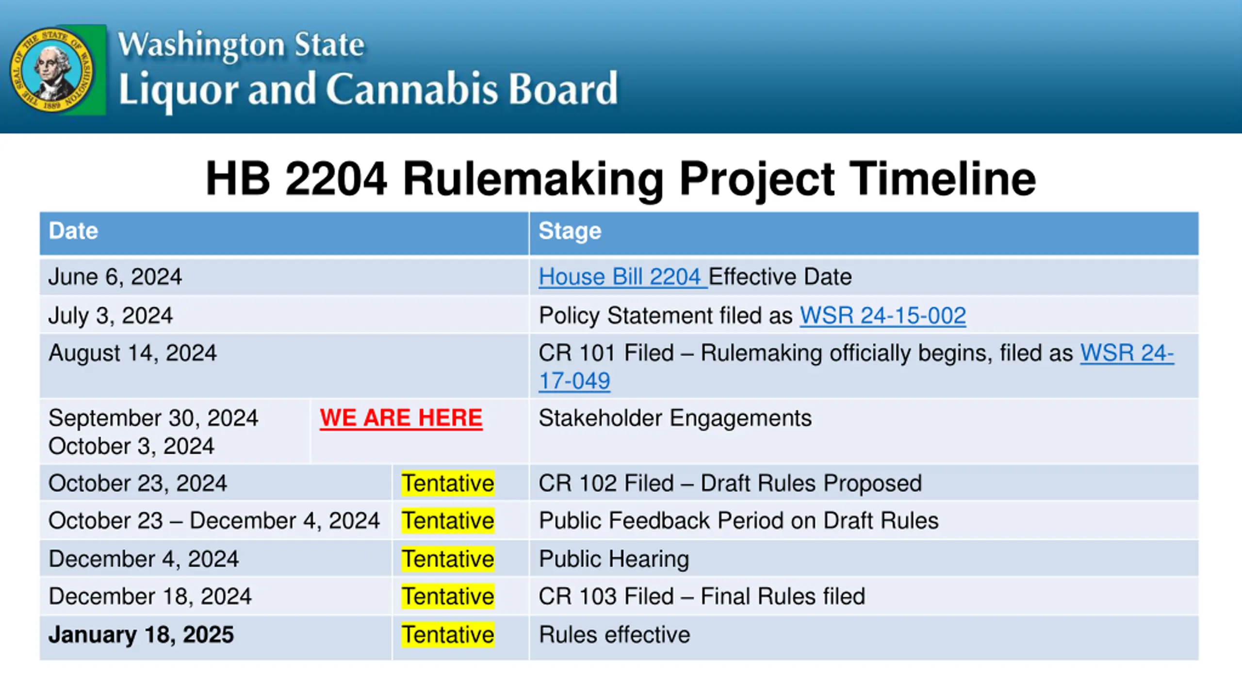 HB 2204 Rulemaking Project Timeline Stage Date June 6, 2024 July 3, 2024 August 14, 2024 House Bill 2204 Effective Date Policy Statement filed as WSR 24-15-002 CR 101 Filed Rulemaking officially begins, filed as WSR 24- 17-049 Stakeholder Engagements September 30, 2024 October 3, 2024 October 23, 2024 October 23 December 4, 2024 Tentative December 4, 2024 December 18, 2024 January 18, 2025 WE ARE HERE Tentative CR 102 Filed Draft Rules Proposed Public Feedback Period on Draft Rules Public Hearing CR 103 Filed Final Rules filed Rules effective Tentative Tentative Tentative