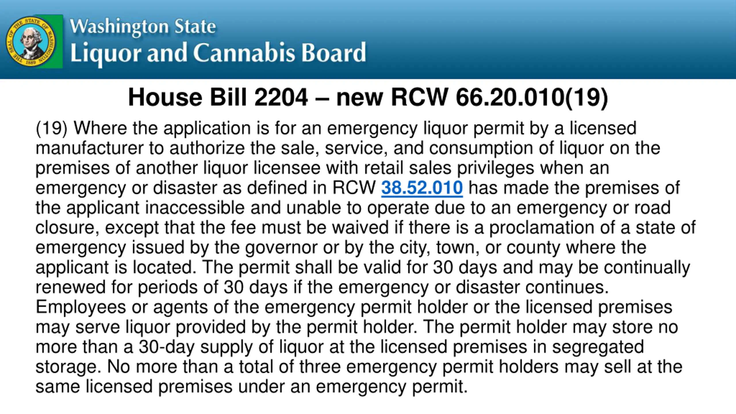 House Bill 2204 new RCW 66.20.010(19) (19) Where the application is for an emergency liquor permit by a licensed manufacturer to authorize the sale, service, and consumption of liquor on the premises of another liquor licensee with retail sales privileges when an emergency or disaster as defined in RCW 38.52.010 has made the premises of the applicant inaccessible and unable to operate due to an emergency or road closure, except that the fee must be waived if there is a proclamation of a state of emergency issued by the governor or by the city, town, or county where the applicant is located. The permit shall be valid for 30 days and may be continually renewed for periods of 30 days if the emergency or disaster continues. Employees or agents of the emergency permit holder or the licensed premises may serve liquor provided by the permit holder. The permit holder may store no more than a 30-day supply of liquor at the licensed premises in segregated storage. No more than a total of three emergency permit holders may sell at the same licensed premises under an emergency permit.