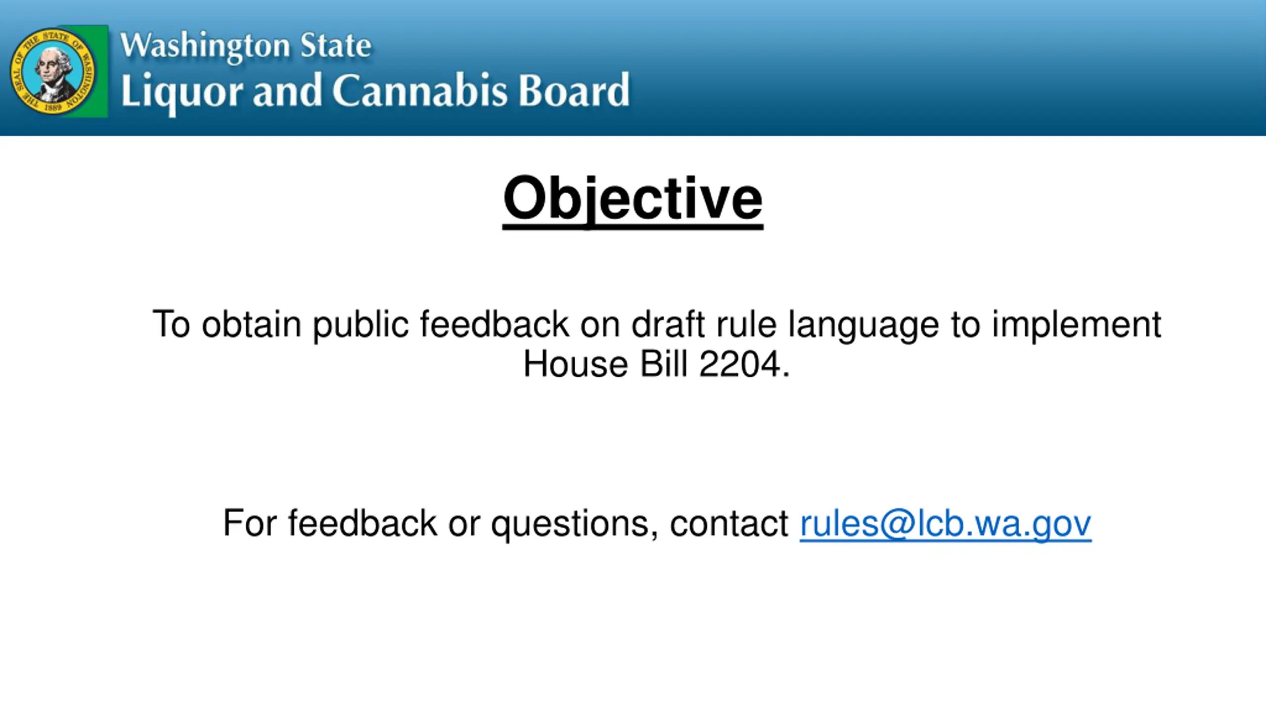 Objective To obtain public feedback on draft rule language to implement House Bill 2204. For feedback or questions, contact rules@lcb.wa.gov
