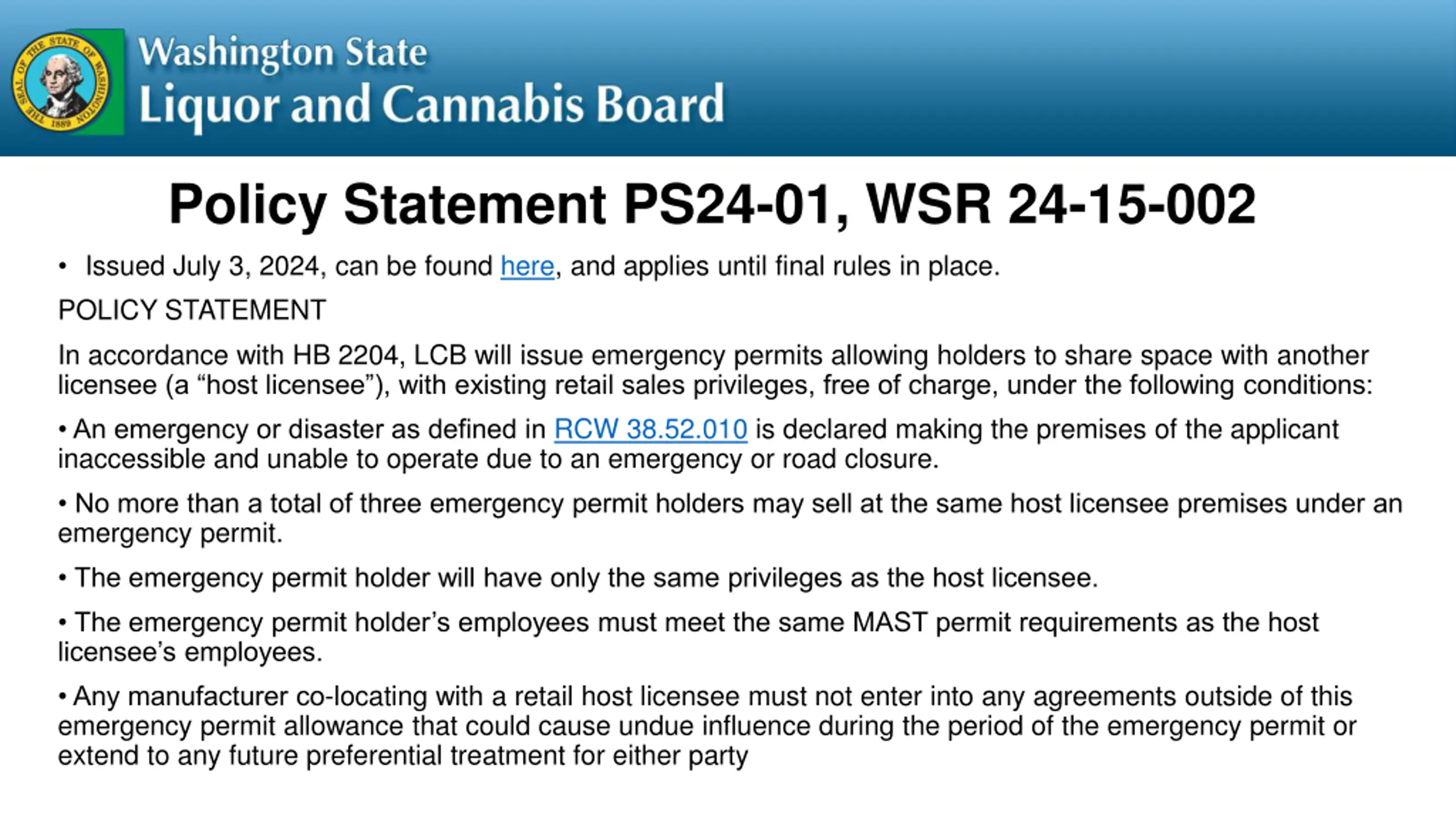 Policy Statement PS24-01, WSR 24-15-002 Issued July 3, 2024, can be found here, and applies until final rules in place. POLICY STATEMENT In accordance with HB 2204, LCB will issue emergency permits allowing holders to share space with another licensee (a host licensee ), with existing retail sales privileges, free of charge, under the following conditions: An emergency or disaster as defined in RCW 38.52.010 is declared making the premises of the applicant inaccessible and unable to operate due to an emergency or road closure. No more than a total of three emergency permit holders may sell at the same host licensee premises under an emergency permit. The emergency permit holder will have only the same privileges as the host licensee. The emergency permit holder s employees must meet the same MAST permit requirements as the host licensee s employees. Any manufacturer co-locating with a retail host licensee must not enter into any agreements outside of this emergency permit allowance that could cause undue influence during the period of the emergency permit or extend to any future preferential treatment for either party