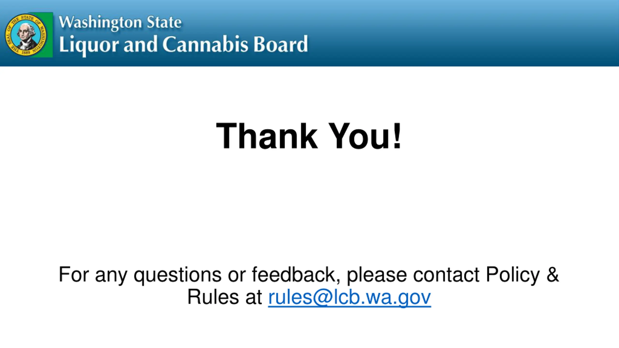 Thank You! For any questions or feedback, please contact Policy & Rules at rules@lcb.wa.gov