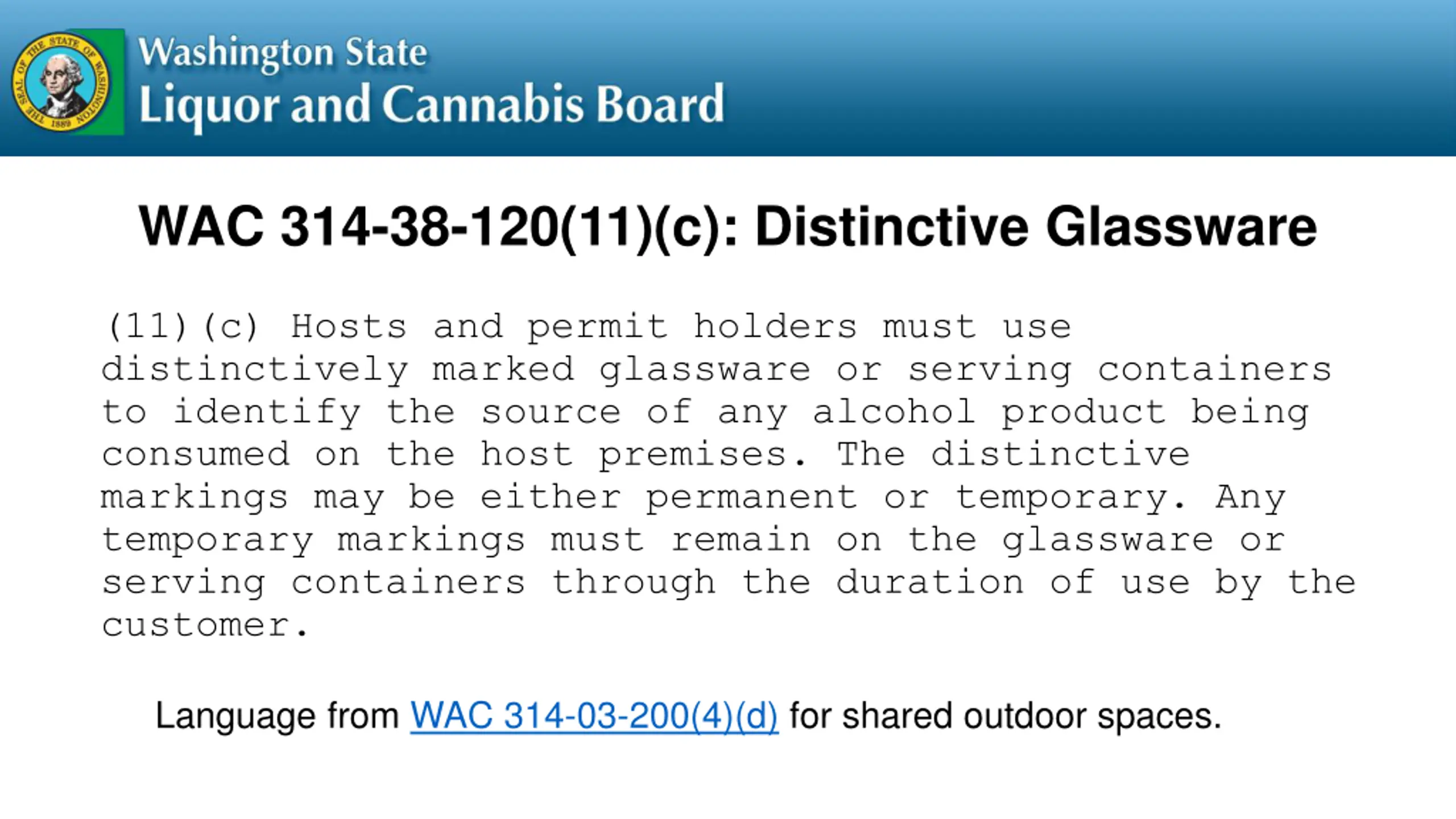 WAC 314-38-120(11)(c): Distinctive Glassware (11)(c) Hosts and permit holders must use distinctively marked glassware or serving containers to identify the source of any alcohol product being consumed on the host premises. The distinctive markings may be either permanent or temporary. Any temporary markings must remain on the glassware or serving containers through the duration of use by the customer. Language from WAC 314-03-200(4)(d) for shared outdoor spaces.