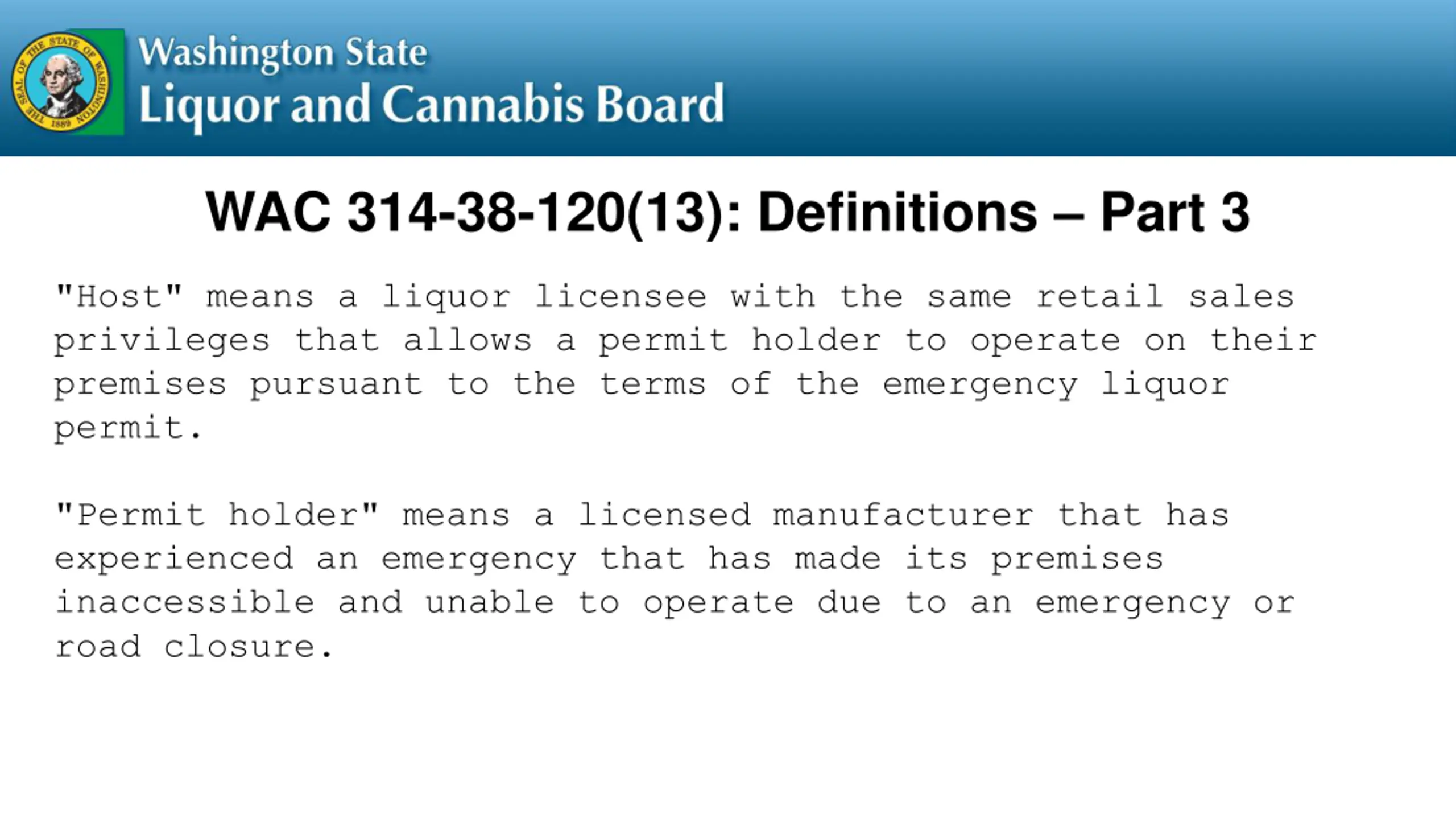 WAC 314-38-120(13): Definitions Part 3 "Host" means a liquor licensee with the same retail sales privileges that allows a permit holder to operate on their premises pursuant to the terms of the emergency liquor permit. "Permit holder" means a licensed manufacturer that has experienced an emergency that has made its premises inaccessible and unable to operate due to an emergency or road closure.