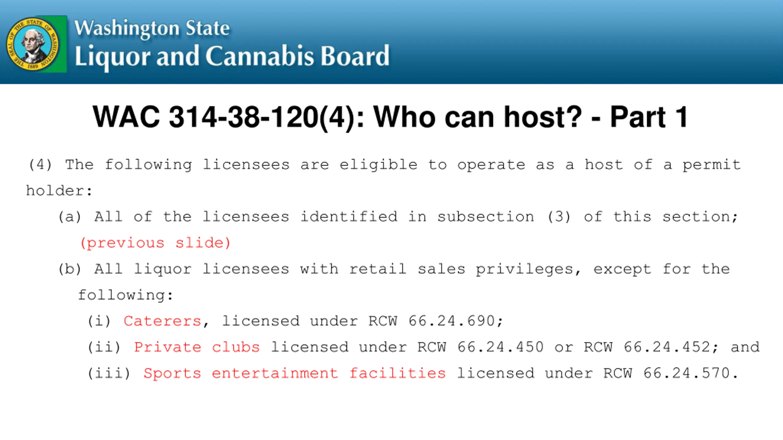 WAC 314-38-120(4): Who can host? - Part 1 (4) The following licensees are eligible to operate as a host of a permit holder: (a) All of the licensees identified in subsection (3) of this section; (previous slide) (b) All liquor licensees with retail sales privileges, except for the following: (i) Caterers, licensed under RCW 66.24.690; (ii) Private clubs licensed under RCW 66.24.450 or RCW 66.24.452; and (iii) Sports entertainment facilities licensed under RCW 66.24.570.