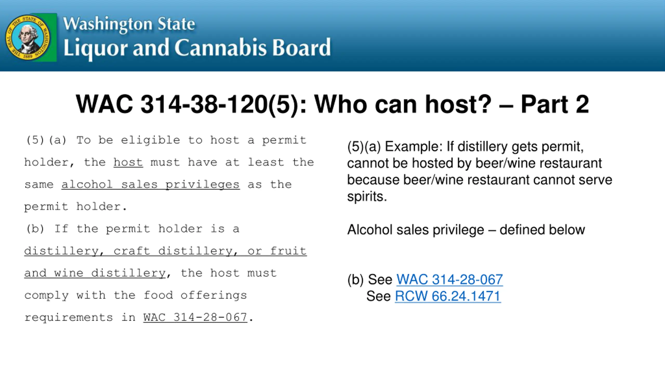 WAC 314-38-120(5): Who can host? Part 2 (5)(a) To be eligible to host a permit (5)(a) Example: If distillery gets permit, cannot be hosted by beer/wine restaurant because beer/wine restaurant cannot serve spirits. holder, the host must have at least the same alcohol sales privileges as the permit holder. Alcohol sales privilege defined below (b) If the permit holder is a distillery, craft distillery, or fruit and wine distillery, the host must (b) See WAC 314-28-067 See RCW 66.24.1471 comply with the food offerings requirements in WAC 314-28-067.