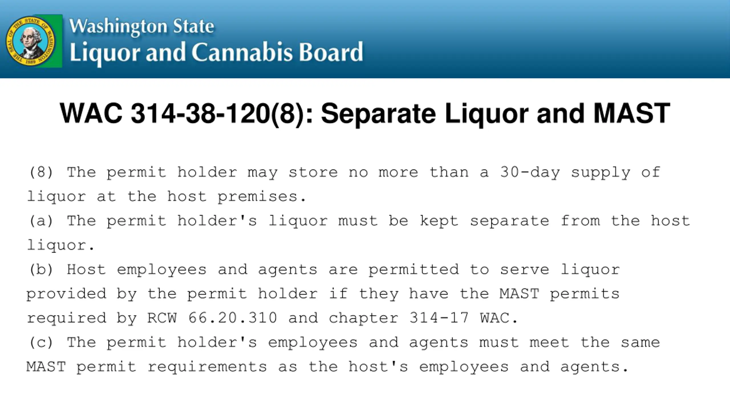 WAC 314-38-120(8): Separate Liquor and MAST (8) The permit holder may store no more than a 30-day supply of liquor at the host premises. (a) The permit holder's liquor must be kept separate from the host liquor. (b) Host employees and agents are permitted to serve liquor provided by the permit holder if they have the MAST permits required by RCW 66.20.310 and chapter 314-17 WAC. (c) The permit holder's employees and agents must meet the same MAST permit requirements as the host's employees and agents.