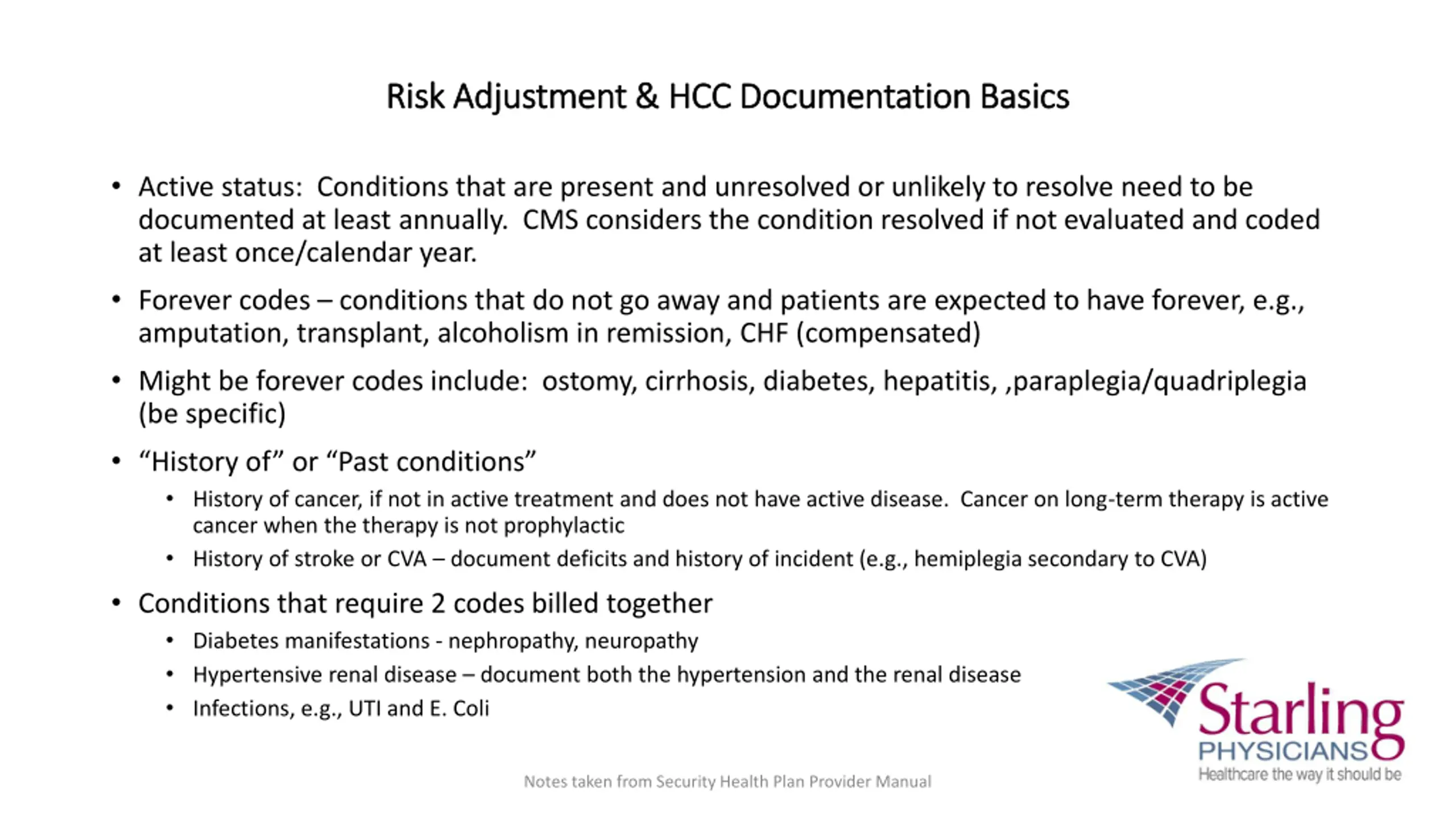Risk Adjustment & HCC Documentation Basics Risk Adjustment & HCC Documentation Basics Active status: Conditions that are present and unresolved or unlikely to resolve need to be documented at least annually. CMS considers the condition resolved if not evaluated and coded at least once/calendar year. Forever codes conditions that do not go away and patients are expected to have forever, e.g., amputation, transplant, alcoholism in remission, CHF (compensated) Might be forever codes include: ostomy, cirrhosis, diabetes, hepatitis, ,paraplegia/quadriplegia (be specific) History of or Past conditions History of cancer, if not in active treatment and does not have active disease. Cancer on long-term therapy is active cancer when the therapy is not prophylactic History of stroke or CVA document deficits and history of incident (e.g., hemiplegia secondary to CVA) Conditions that require 2 codes billed together Diabetes manifestations - nephropathy, neuropathy Hypertensive renal disease document both the hypertension and the renal disease Infections, e.g., UTI and E. Coli Notes taken from Security Health Plan Provider Manual