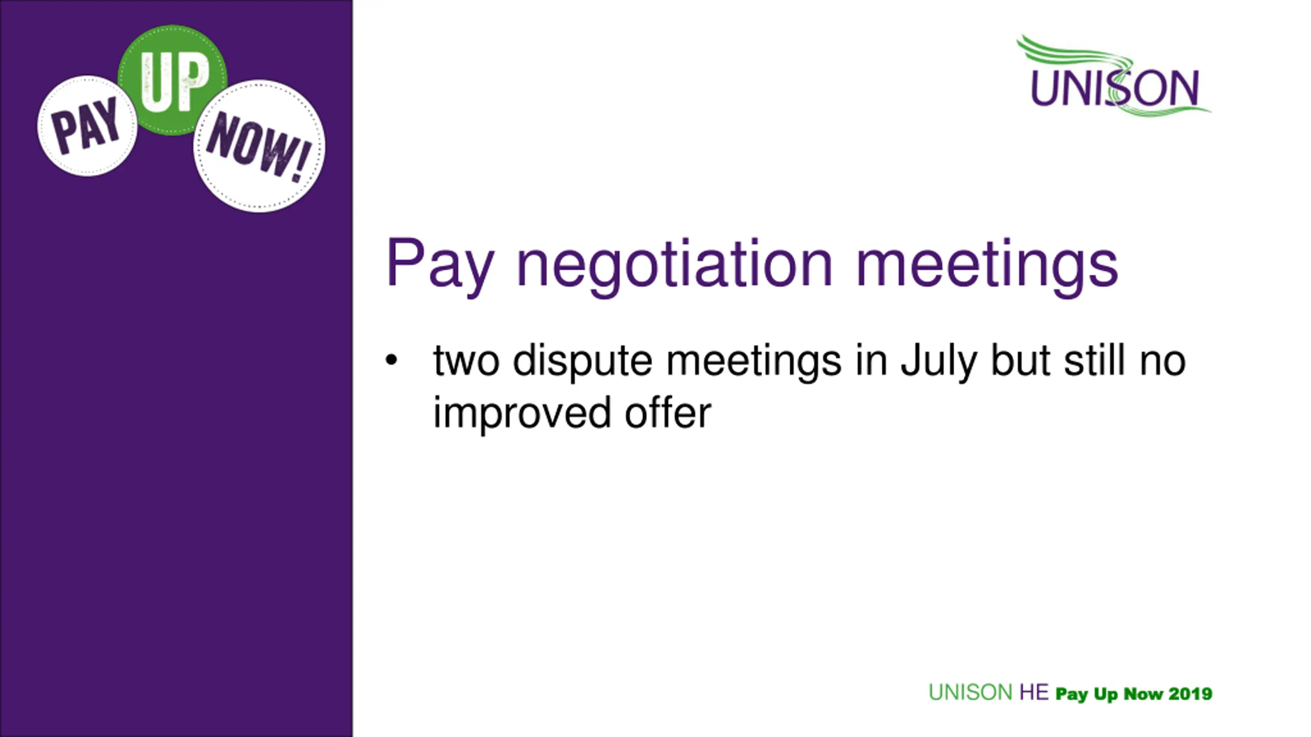 Pay negotiation meetings two dispute meetings in July but still no improved offer UNISON HE Pay Up Now 2019 Pay Up Now 2019