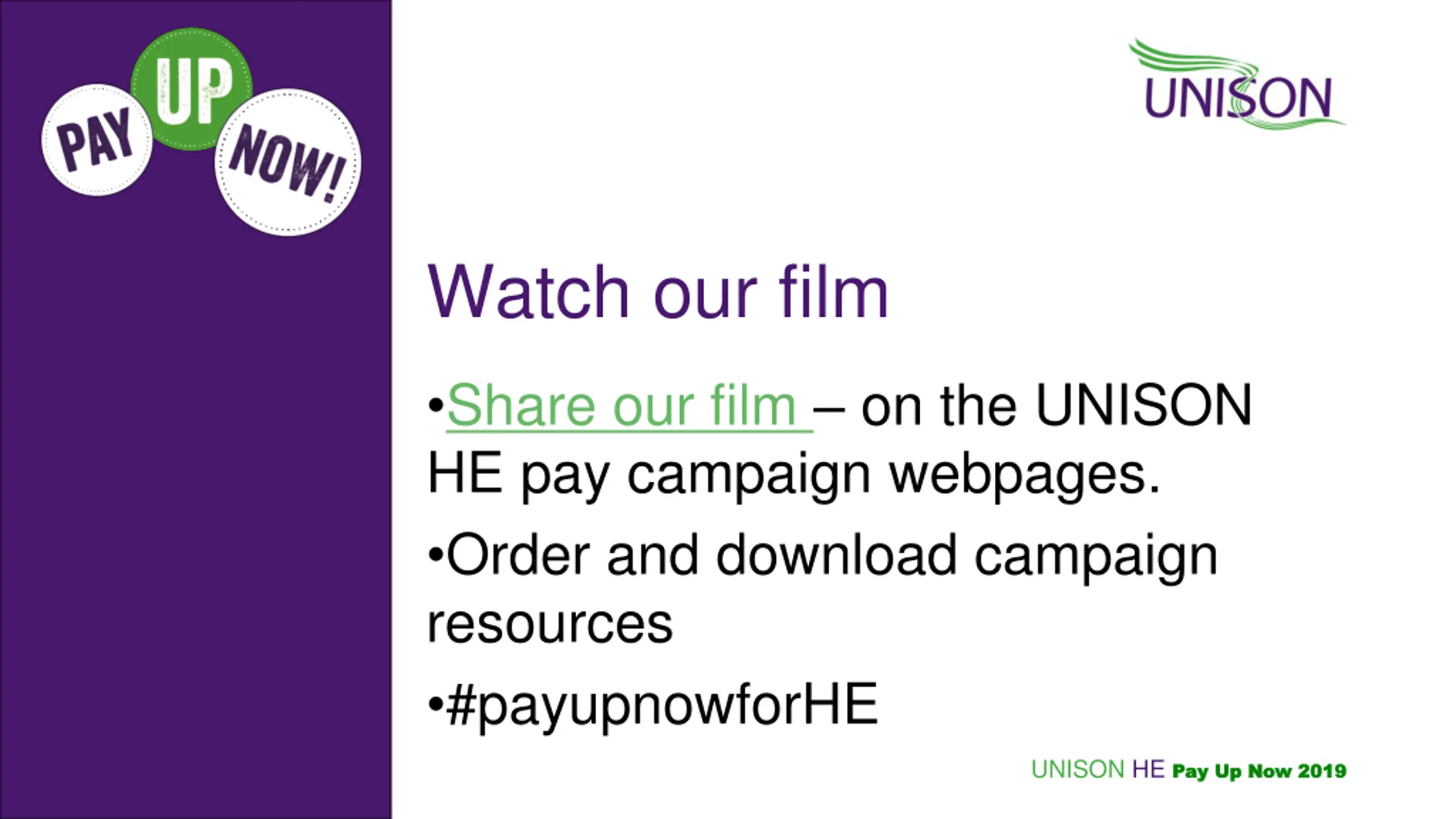 Watch our film Share our film on the UNISON HE pay campaign webpages. Order and download campaign resources #payupnowforHE UNISON HE Pay Up Now 2019 Pay Up Now 2019
