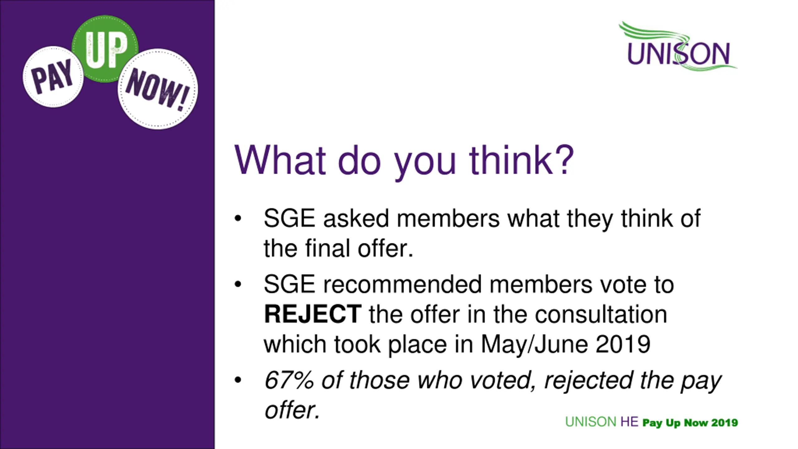 What do you think? SGE asked members what they think of the final offer. SGE recommended members vote to REJECT the offer in the consultation which took place in May/June 2019 67% of those who voted, rejected the pay offer. UNISON HE Pay Up Now 2019 Pay Up Now 2019