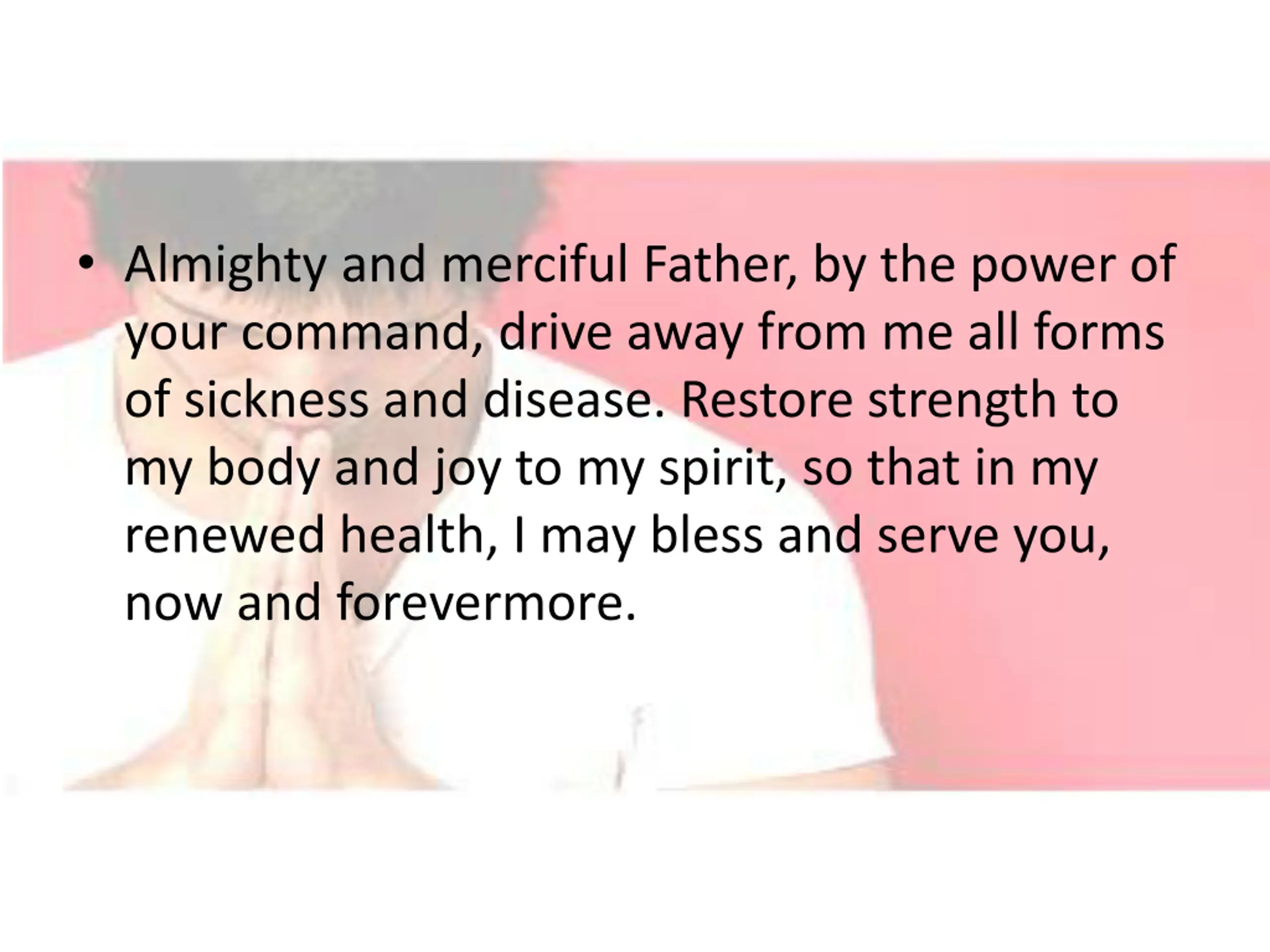 Almighty and merciful Father, by the power of your command, drive away from me all forms of sickness and disease. Restore strength to my body and joy to my spirit, so that in my renewed health, I may bless and serve you, now and forevermore.