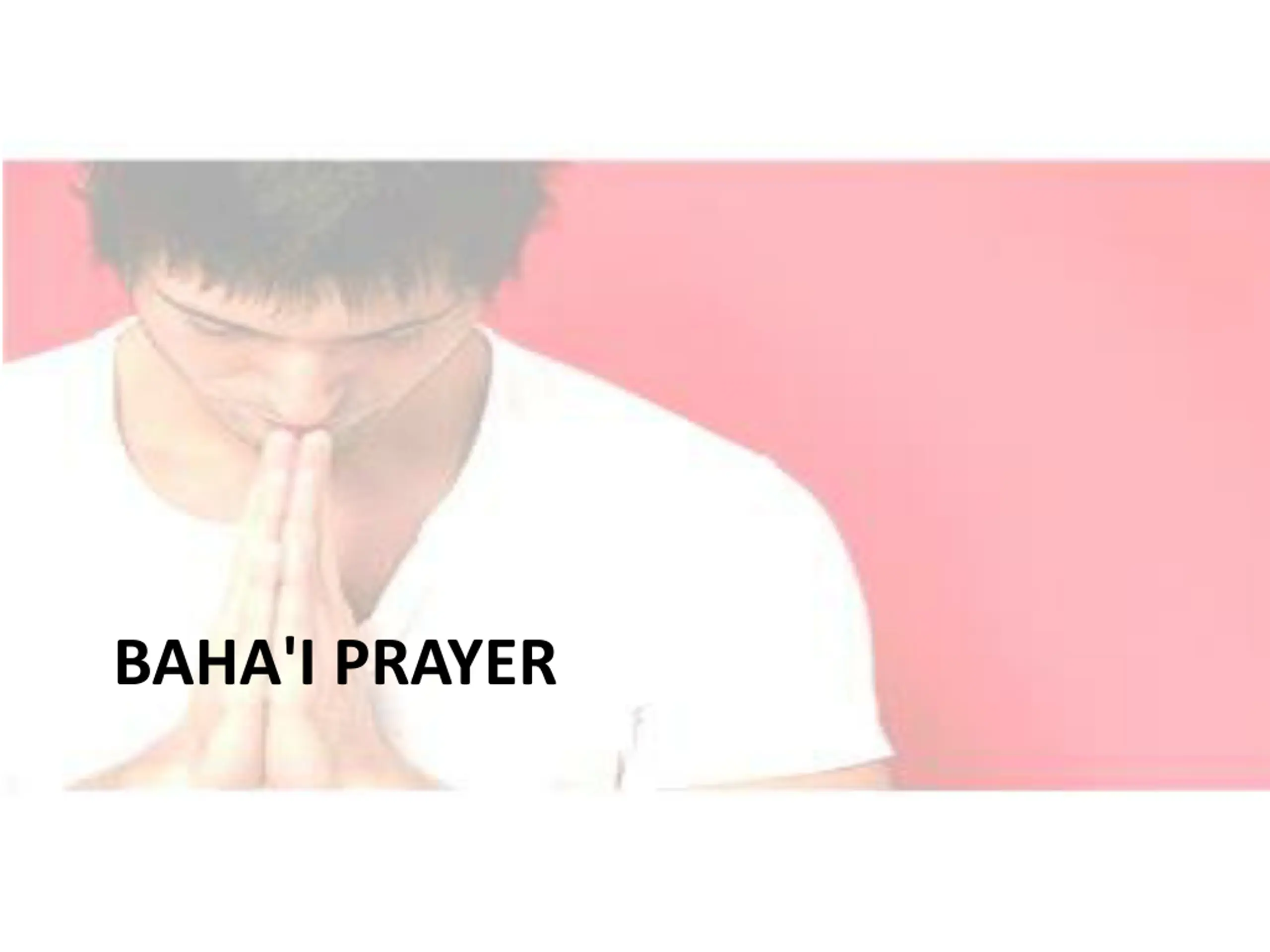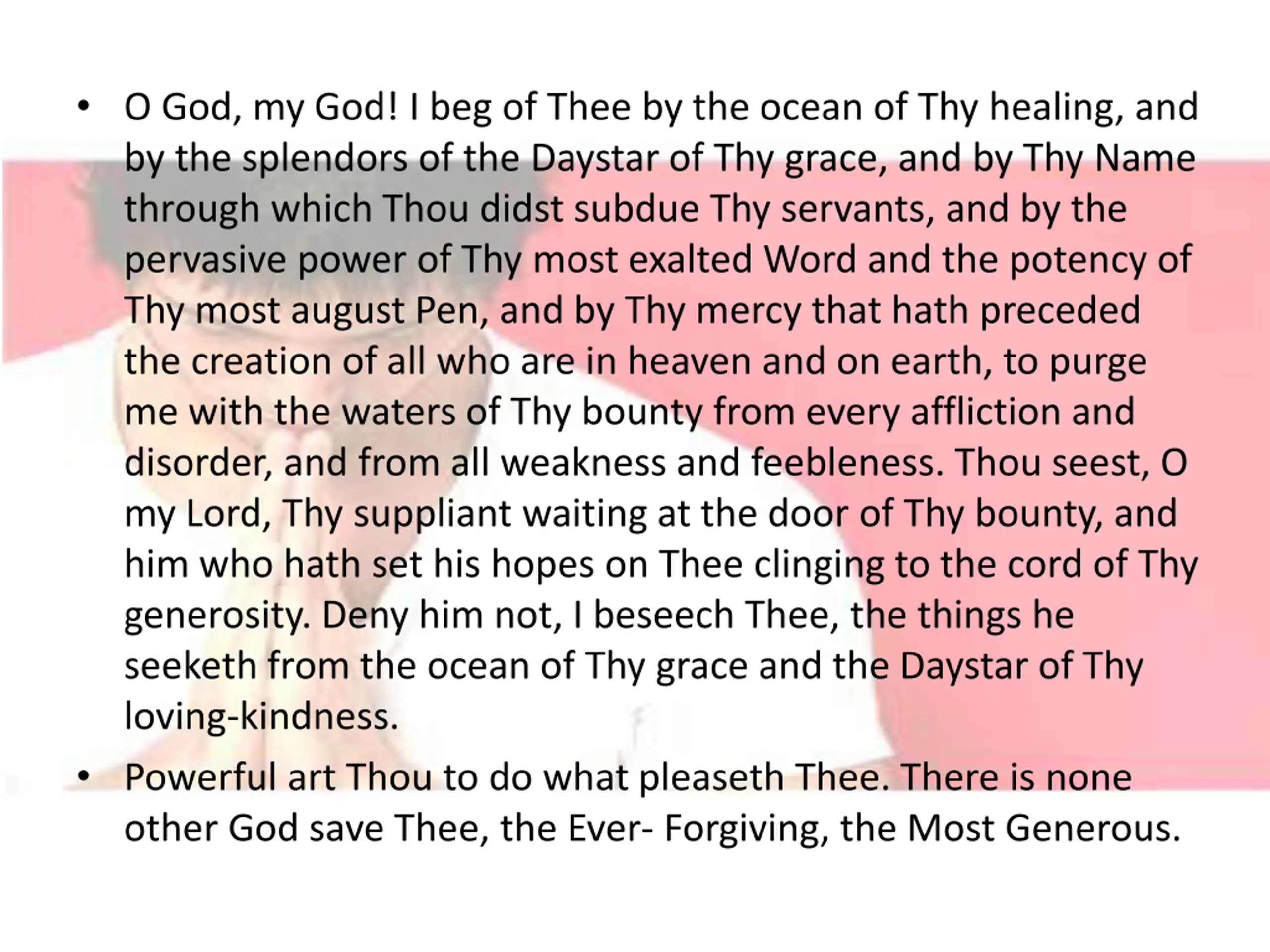 O God, my God! I beg of Thee by the ocean of Thy healing, and by the splendors of the Daystar of Thy grace, and by Thy Name through which Thou didst subdue Thy servants, and by the pervasive power of Thy most exalted Word and the potency of Thy most august Pen, and by Thy mercy that hath preceded the creation of all who are in heaven and on earth, to purge me with the waters of Thy bounty from every affliction and disorder, and from all weakness and feebleness. Thou seest, O my Lord, Thy suppliant waiting at the door of Thy bounty, and him who hath set his hopes on Thee clinging to the cord of Thy generosity. Deny him not, I beseech Thee, the things he seeketh from the ocean of Thy grace and the Daystar of Thy loving-kindness. Powerful art Thou to do what pleaseth Thee. There is none other God save Thee, the Ever- Forgiving, the Most Generous.