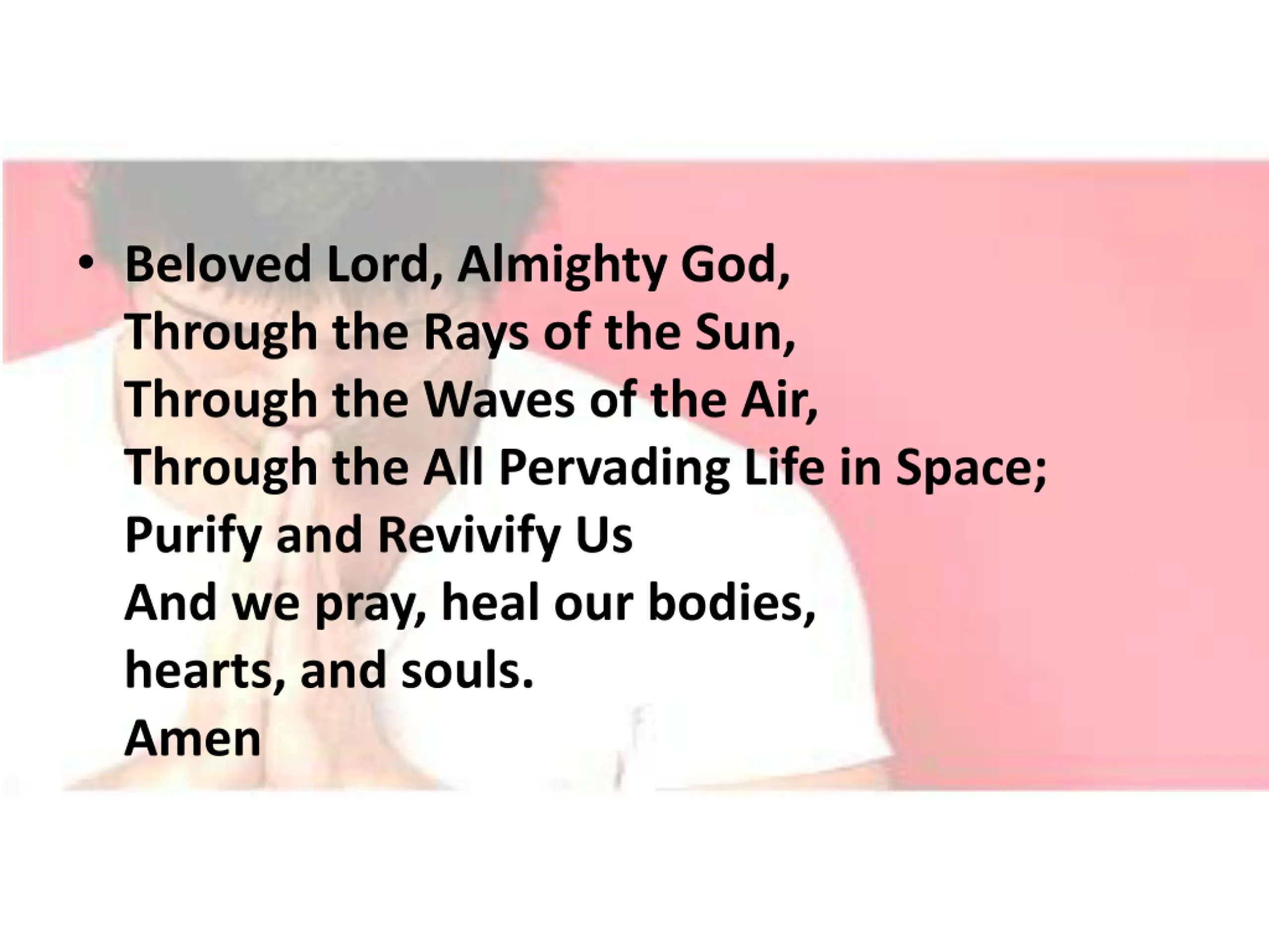 Beloved Lord, Almighty God, Through the Rays of the Sun, Through the Waves of the Air, Through the All Pervading Life in Space; Purify and Revivify Us And we pray, heal our bodies, hearts, and souls. Amen