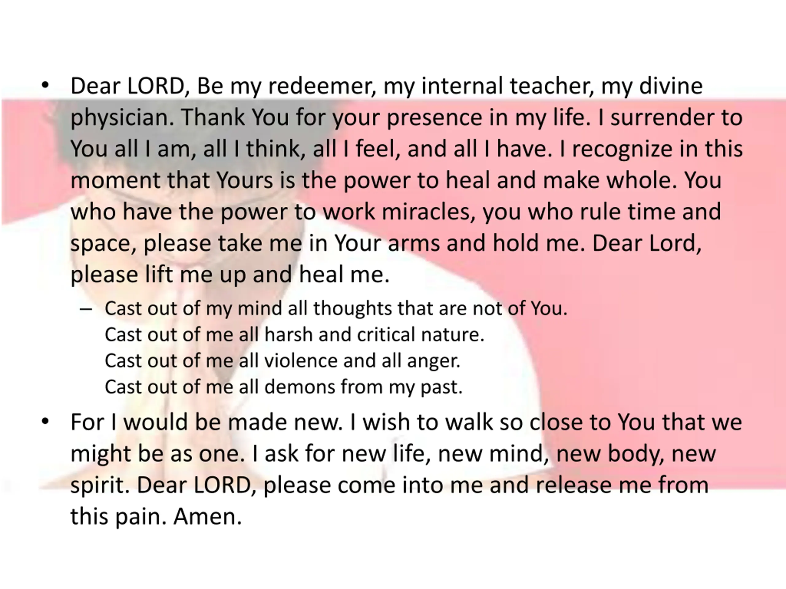 Dear LORD, Be my redeemer, my internal teacher, my divine physician. Thank You for your presence in my life. I surrender to You all I am, all I think, all I feel, and all I have. I recognize in this moment that Yours is the power to heal and make whole. You who have the power to work miracles, you who rule time and space, please take me in Your arms and hold me. Dear Lord, please lift me up and heal me. Cast out of my mind all thoughts that are not of You. Cast out of me all harsh and critical nature. Cast out of me all violence and all anger. Cast out of me all demons from my past. For I would be made new. I wish to walk so close to You that we might be as one. I ask for new life, new mind, new body, new spirit. Dear LORD, please come into me and release me from this pain. Amen.