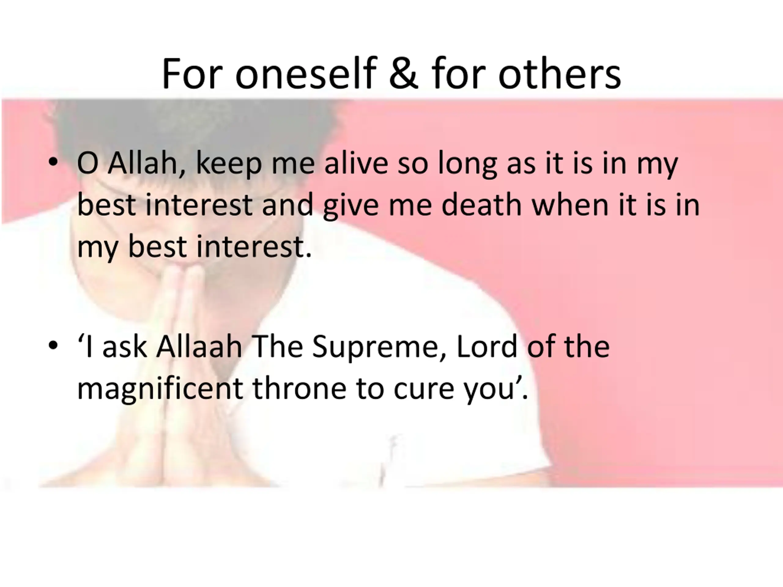 For oneself & for others O Allah, keep me alive so long as it is in my best interest and give me death when it is in my best interest. I ask Allaah The Supreme, Lord of the magnificent throne to cure you .