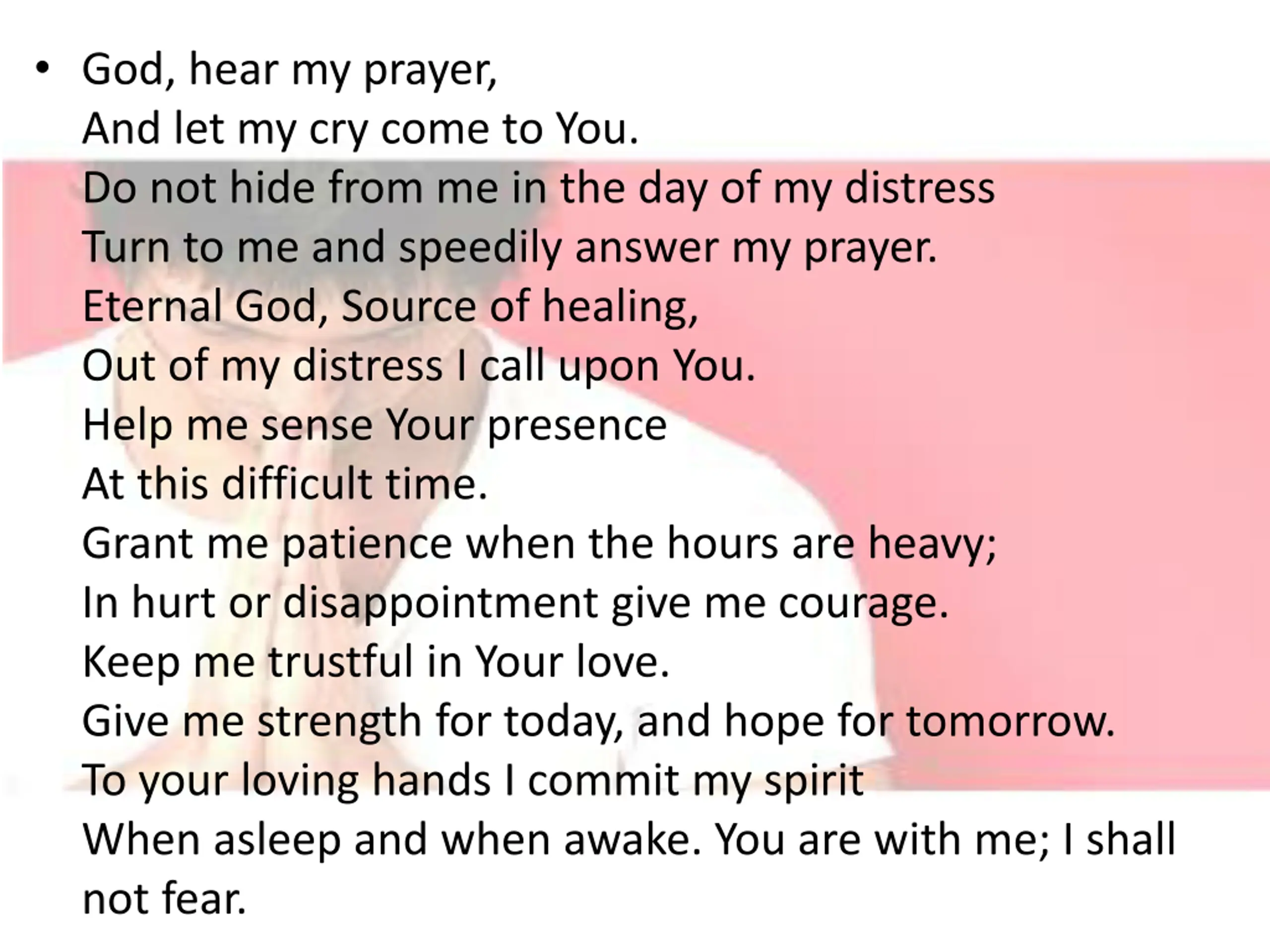God, hear my prayer, And let my cry come to You. Do not hide from me in the day of my distress Turn to me and speedily answer my prayer. Eternal God, Source of healing, Out of my distress I call upon You. Help me sense Your presence At this difficult time. Grant me patience when the hours are heavy; In hurt or disappointment give me courage. Keep me trustful in Your love. Give me strength for today, and hope for tomorrow. To your loving hands I commit my spirit When asleep and when awake. You are with me; I shall not fear.