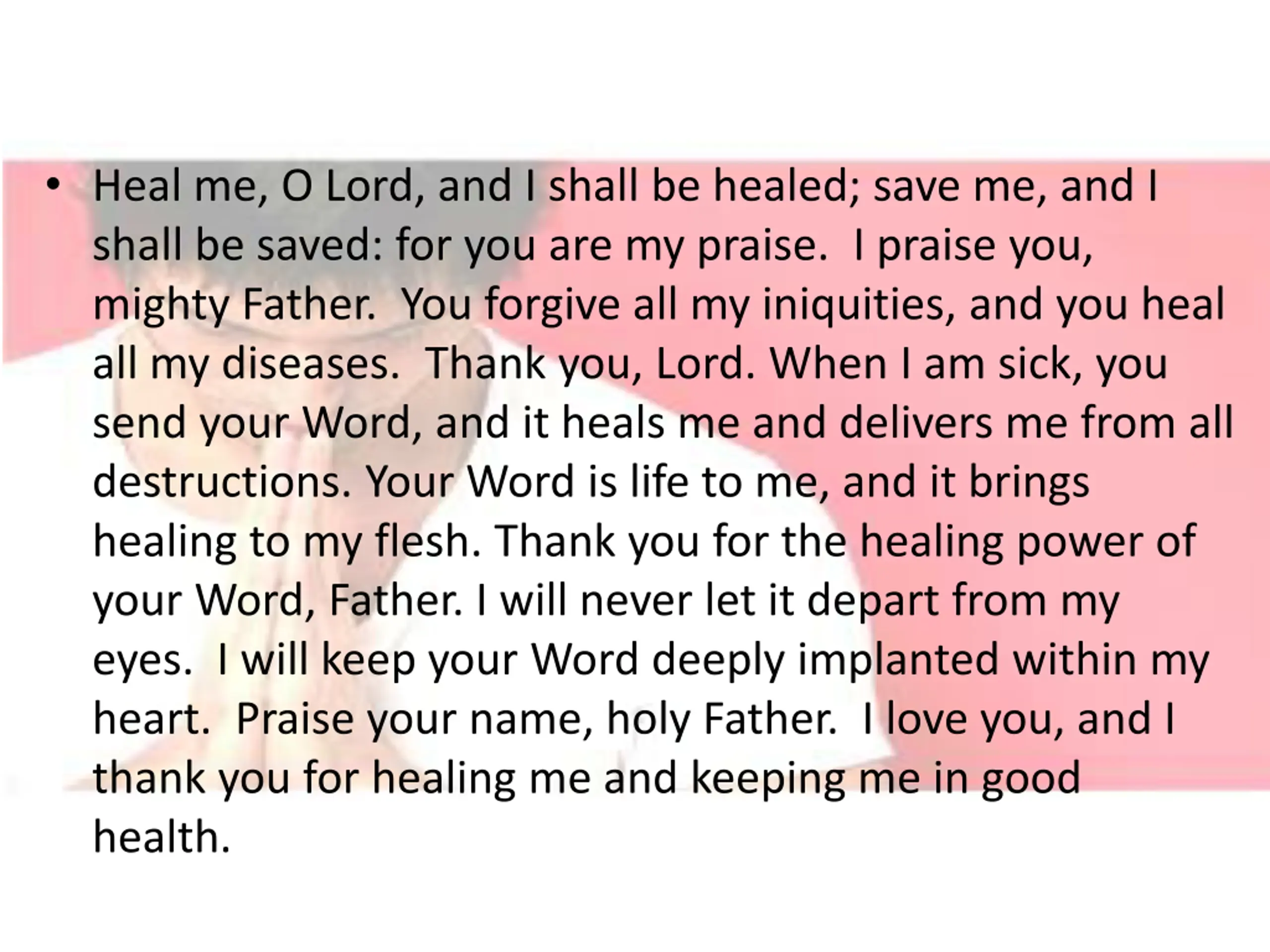 Heal me, O Lord, and I shall be healed; save me, and I shall be saved: for you are my praise. I praise you, mighty Father. You forgive all my iniquities, and you heal all my diseases. Thank you, Lord. When I am sick, you send your Word, and it heals me and delivers me from all destructions. Your Word is life to me, and it brings healing to my flesh. Thank you for the healing power of your Word, Father. I will never let it depart from my eyes. I will keep your Word deeply implanted within my heart. Praise your name, holy Father. I love you, and I thank you for healing me and keeping me in good health.