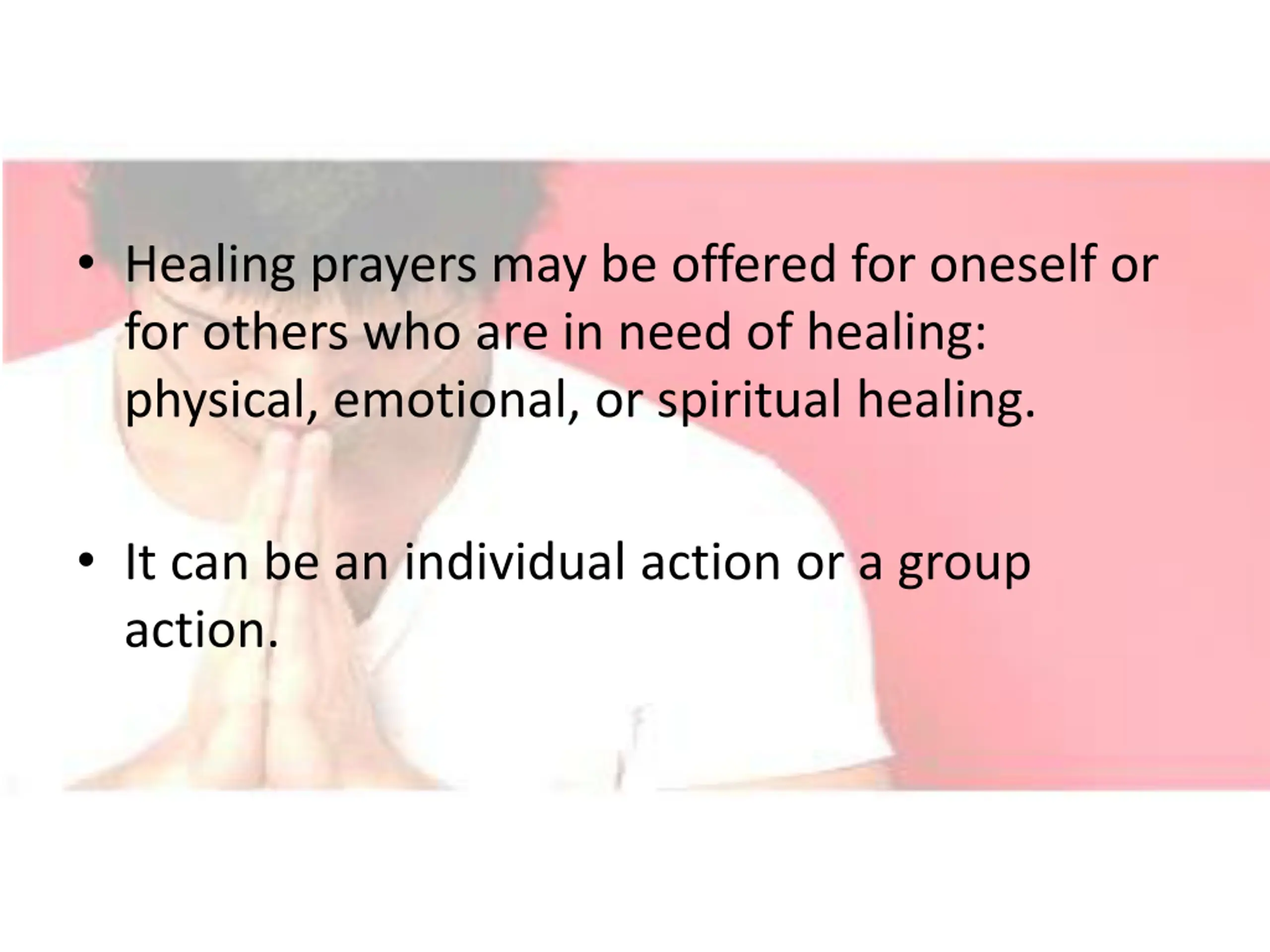 Healing prayers may be offered for oneself or for others who are in need of healing: physical, emotional, or spiritual healing. It can be an individual action or a group action.