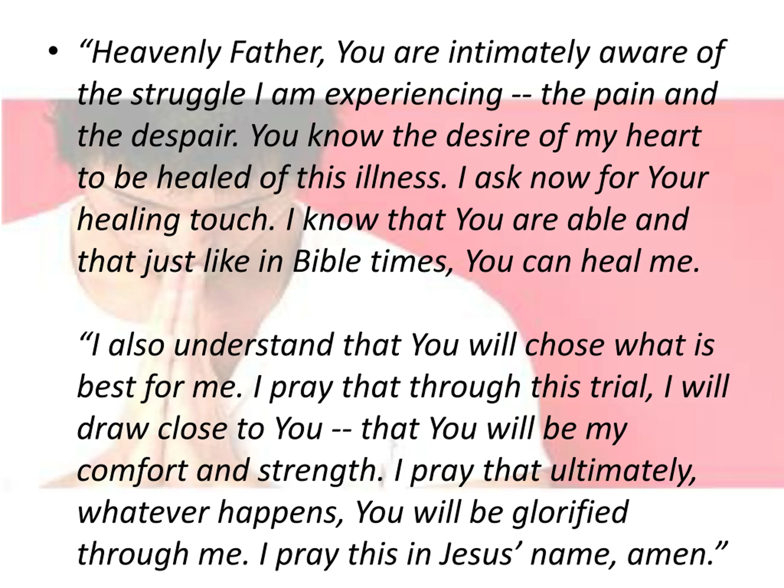 Heavenly Father, You are intimately aware of the struggle I am experiencing -- the pain and the despair. You know the desire of my heart to be healed of this illness. I ask now for Your healing touch. I know that You are able and that just like in Bible times, You can heal me. I also understand that You will chose what is best for me. I pray that through this trial, I will draw close to You -- that You will be my comfort and strength. I pray that ultimately, whatever happens, You will be glorified through me. I pray this in Jesus name, amen.