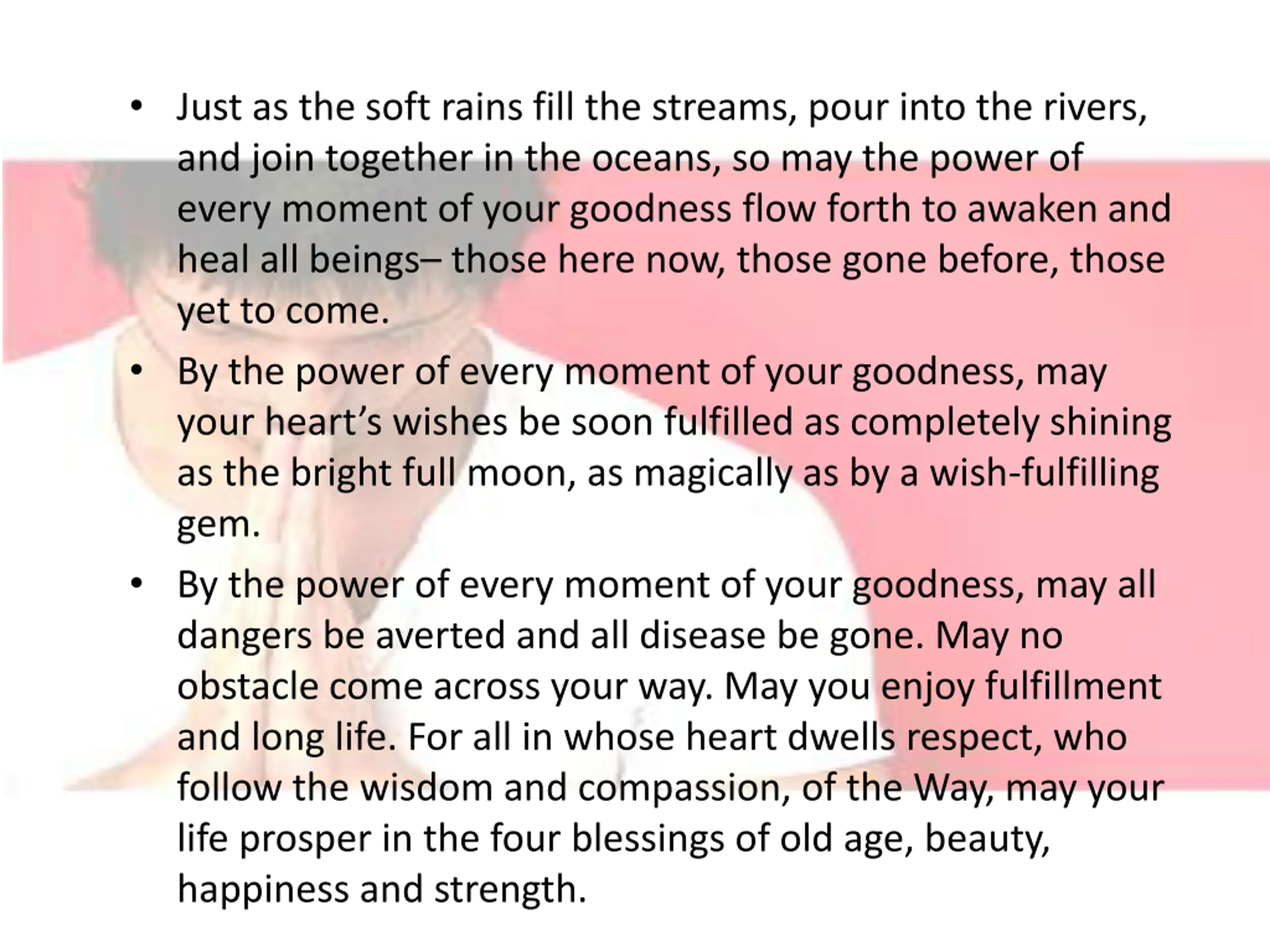 Just as the soft rains fill the streams, pour into the rivers, and join together in the oceans, so may the power of every moment of your goodness flow forth to awaken and heal all beings those here now, those gone before, those yet to come. By the power of every moment of your goodness, may your heart s wishes be soon fulfilled as completely shining as the bright full moon, as magically as by a wish-fulfilling gem. By the power of every moment of your goodness, may all dangers be averted and all disease be gone. May no obstacle come across your way. May you enjoy fulfillment and long life. For all in whose heart dwells respect, who follow the wisdom and compassion, of the Way, may your life prosper in the four blessings of old age, beauty, happiness and strength.