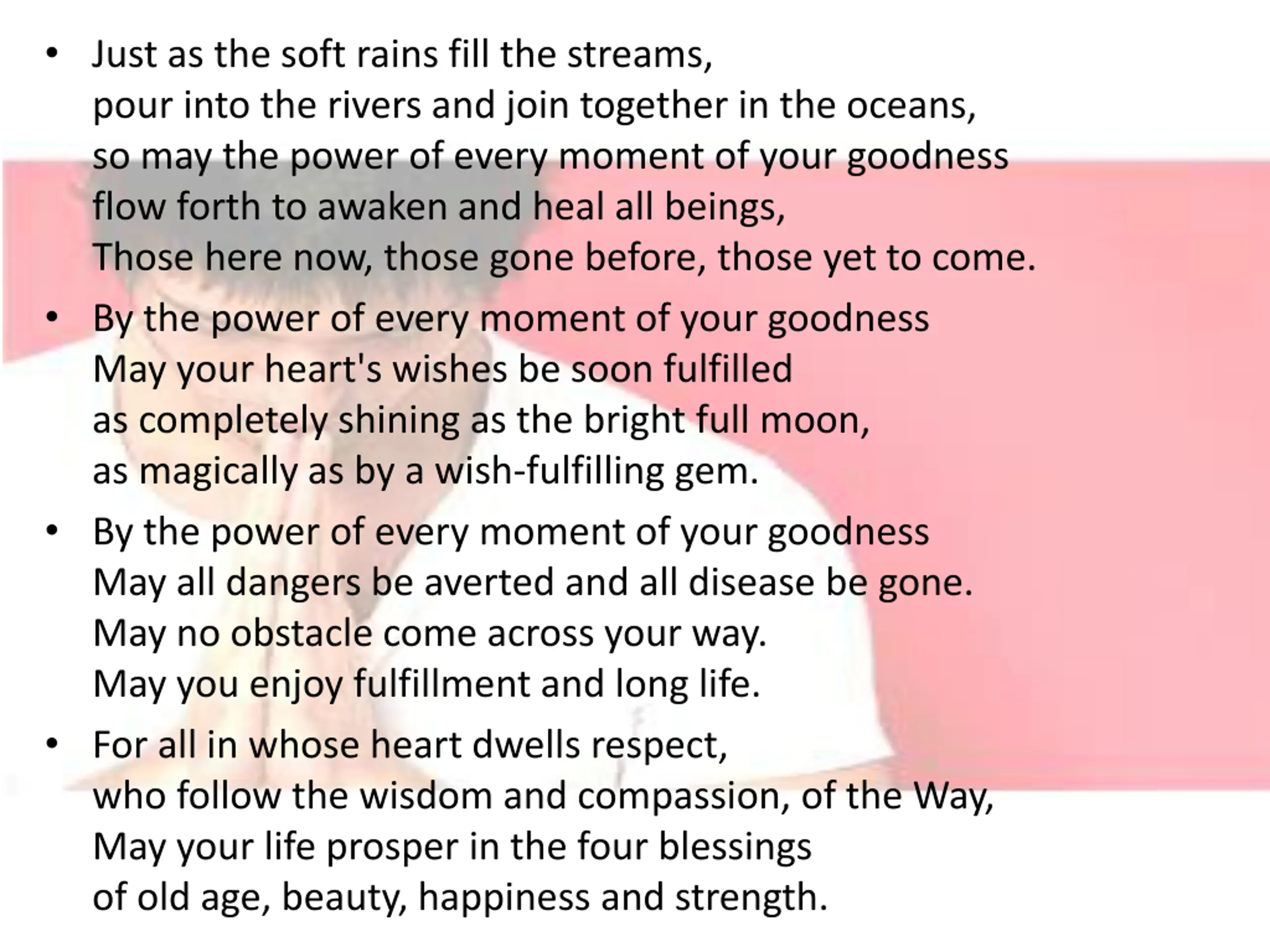 Just as the soft rains fill the streams, pour into the rivers and join together in the oceans, so may the power of every moment of your goodness flow forth to awaken and heal all beings, Those here now, those gone before, those yet to come. By the power of every moment of your goodness May your heart's wishes be soon fulfilled as completely shining as the bright full moon, as magically as by a wish-fulfilling gem. By the power of every moment of your goodness May all dangers be averted and all disease be gone. May no obstacle come across your way. May you enjoy fulfillment and long life. For all in whose heart dwells respect, who follow the wisdom and compassion, of the Way, May your life prosper in the four blessings of old age, beauty, happiness and strength.