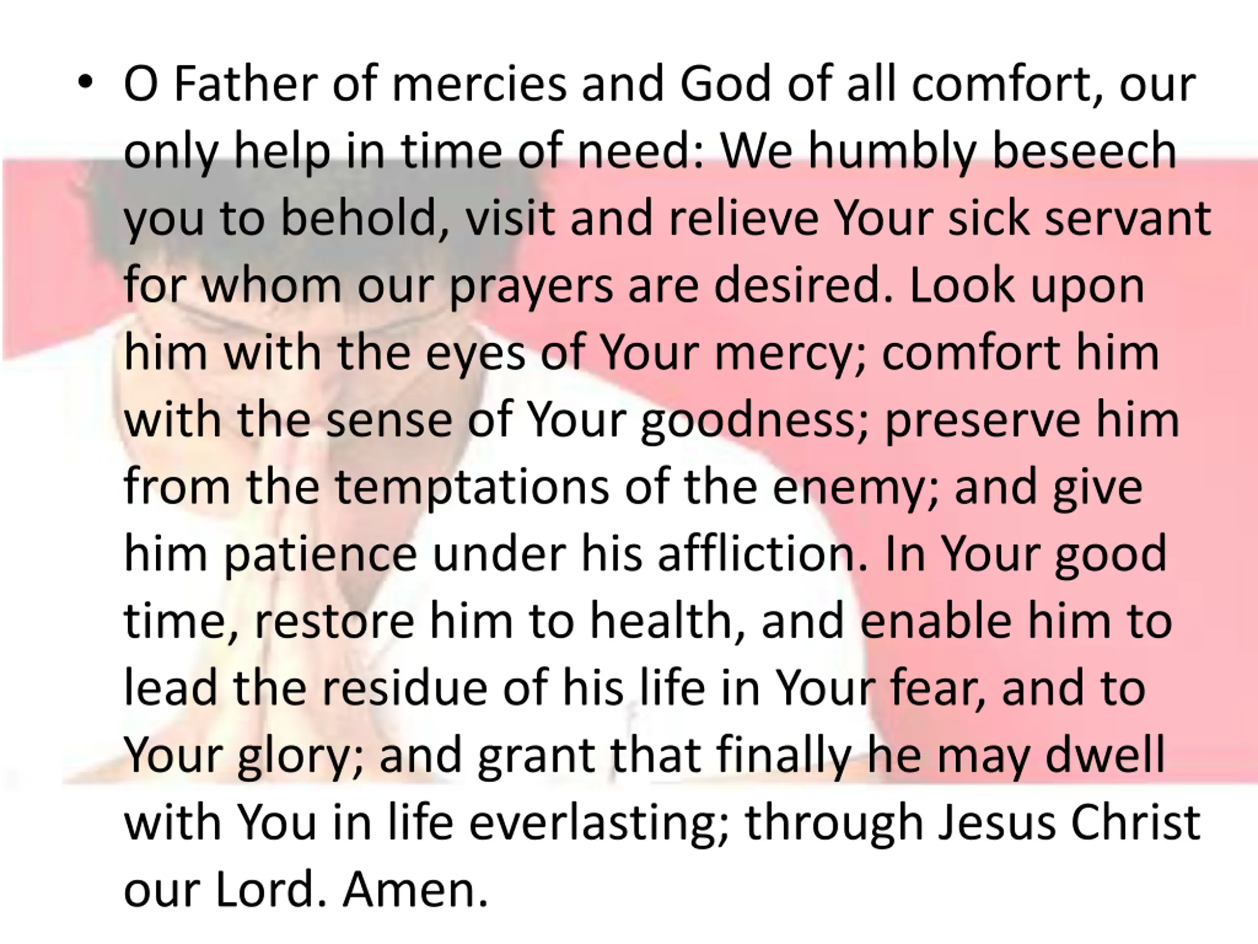 O Father of mercies and God of all comfort, our only help in time of need: We humbly beseech you to behold, visit and relieve Your sick servant for whom our prayers are desired. Look upon him with the eyes of Your mercy; comfort him with the sense of Your goodness; preserve him from the temptations of the enemy; and give him patience under his affliction. In Your good time, restore him to health, and enable him to lead the residue of his life in Your fear, and to Your glory; and grant that finally he may dwell with You in life everlasting; through Jesus Christ our Lord. Amen.