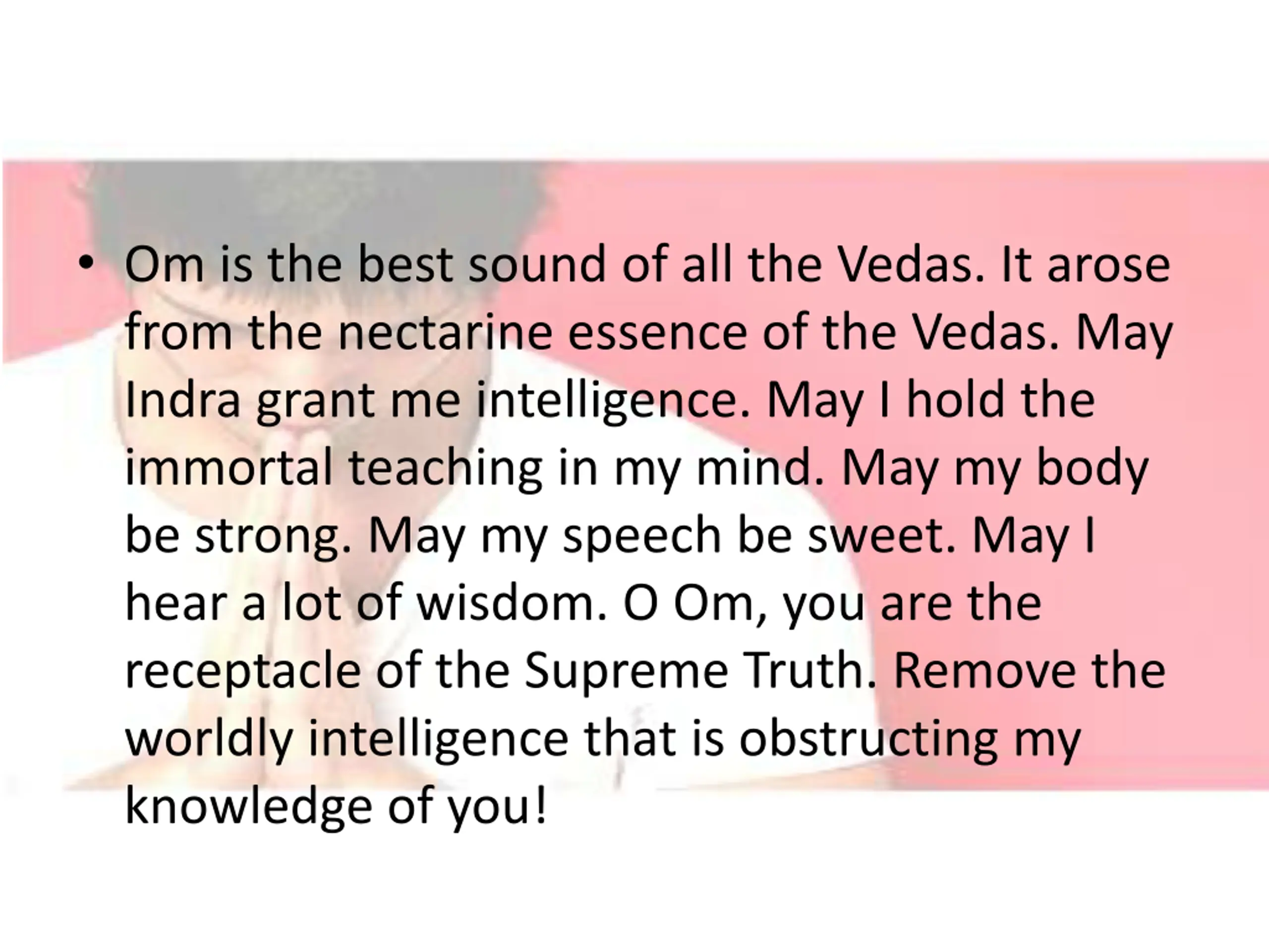 Om is the best sound of all the Vedas. It arose from the nectarine essence of the Vedas. May Indra grant me intelligence. May I hold the immortal teaching in my mind. May my body be strong. May my speech be sweet. May I hear a lot of wisdom. O Om, you are the receptacle of the Supreme Truth. Remove the worldly intelligence that is obstructing my knowledge of you!