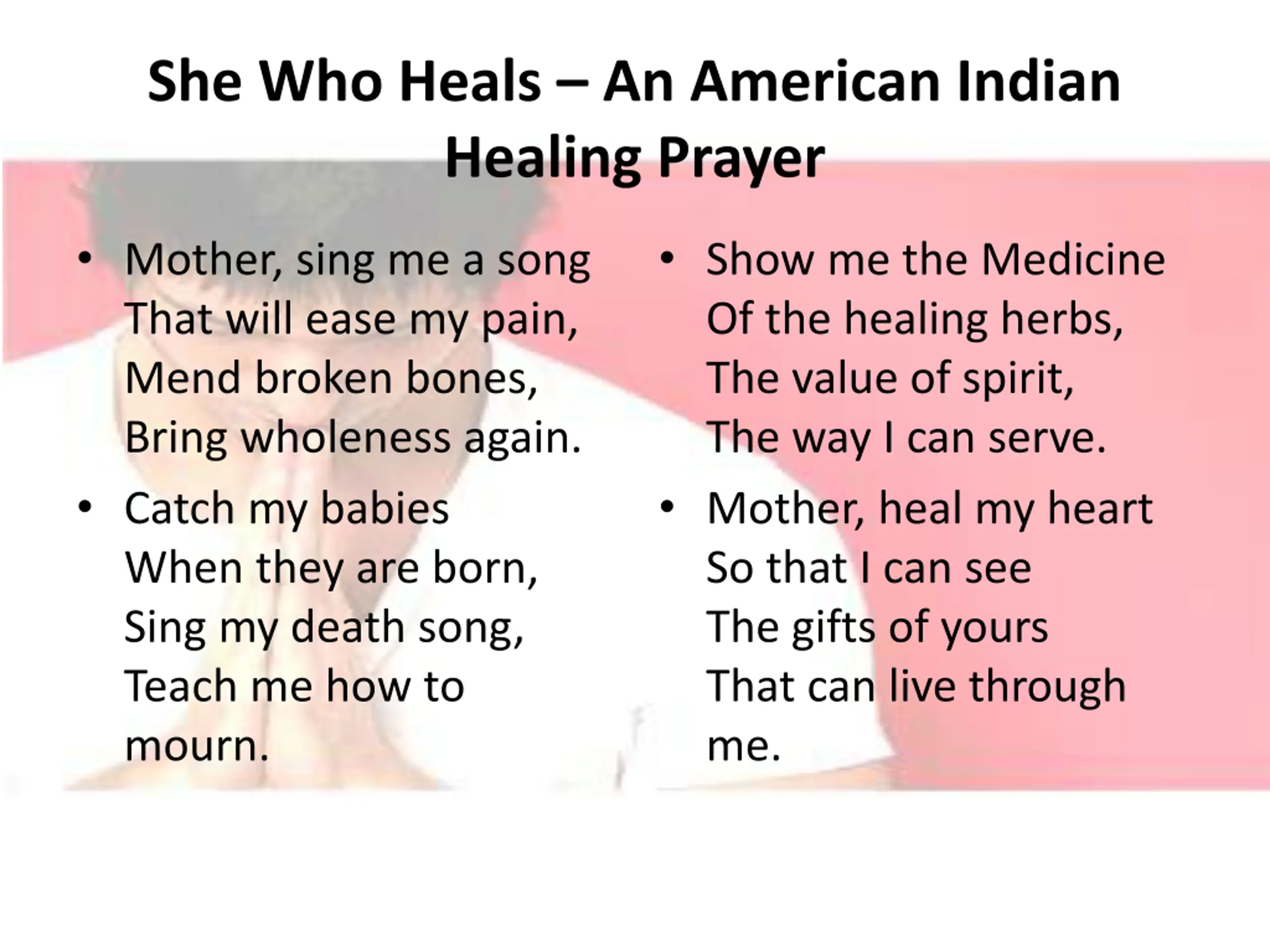 She Who Heals An American Indian Healing Prayer Mother, sing me a song That will ease my pain, Mend broken bones, Bring wholeness again. Catch my babies When they are born, Sing my death song, Teach me how to mourn. Show me the Medicine Of the healing herbs, The value of spirit, The way I can serve. Mother, heal my heart So that I can see The gifts of yours That can live through me.