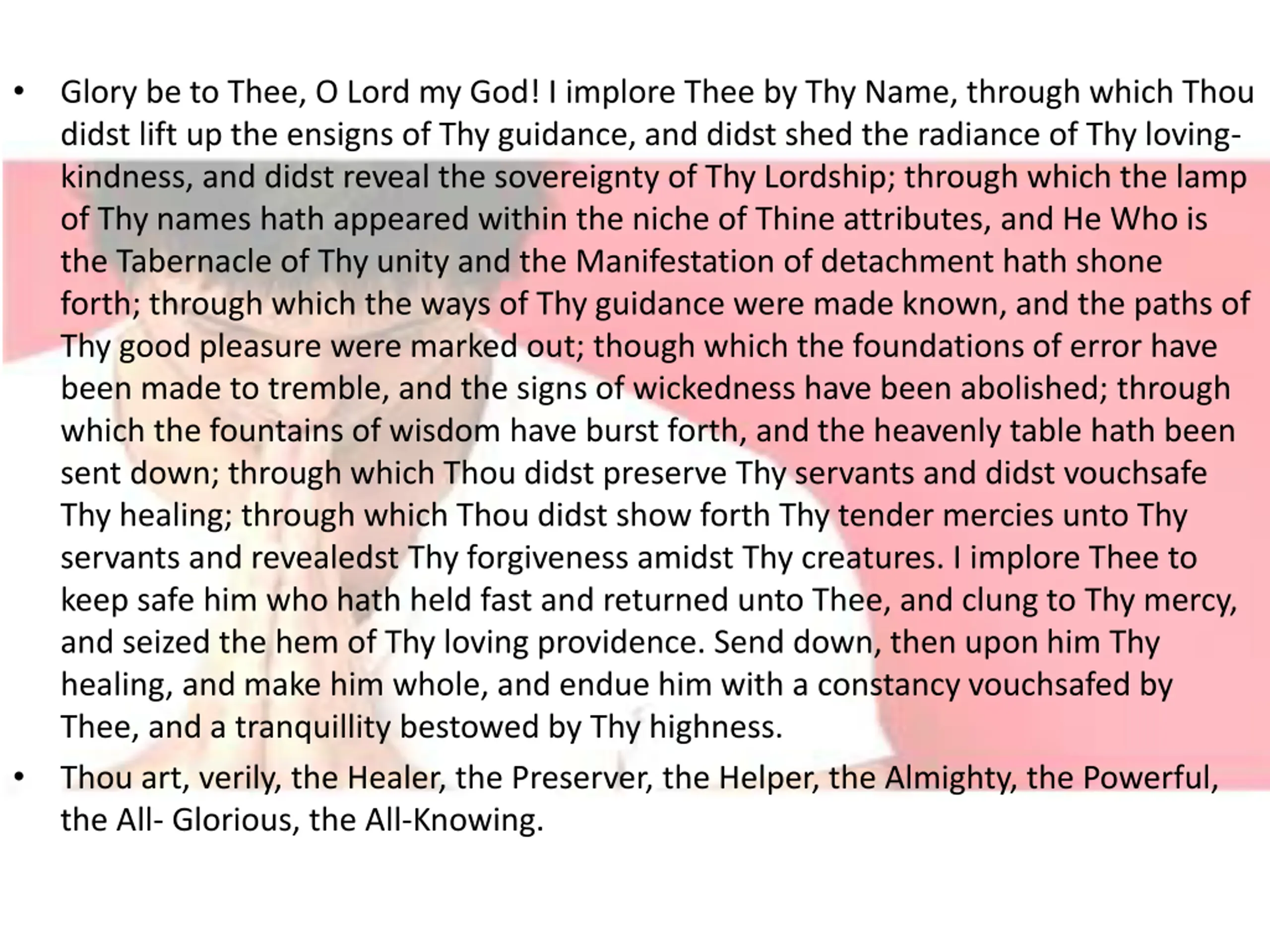 Glory be to Thee, O Lord my God! I implore Thee by Thy Name, through which Thou didst lift up the ensigns of Thy guidance, and didst shed the radiance of Thy loving- kindness, and didst reveal the sovereignty of Thy Lordship; through which the lamp of Thy names hath appeared within the niche of Thine attributes, and He Who is the Tabernacle of Thy unity and the Manifestation of detachment hath shone forth; through which the ways of Thy guidance were made known, and the paths of Thy good pleasure were marked out; though which the foundations of error have been made to tremble, and the signs of wickedness have been abolished; through which the fountains of wisdom have burst forth, and the heavenly table hath been sent down; through which Thou didst preserve Thy servants and didst vouchsafe Thy healing; through which Thou didst show forth Thy tender mercies unto Thy servants and revealedst Thy forgiveness amidst Thy creatures. I implore Thee to keep safe him who hath held fast and returned unto Thee, and clung to Thy mercy, and seized the hem of Thy loving providence. Send down, then upon him Thy healing, and make him whole, and endue him with a constancy vouchsafed by Thee, and a tranquillity bestowed by Thy highness. Thou art, verily, the Healer, the Preserver, the Helper, the Almighty, the Powerful, the All- Glorious, the All-Knowing.
