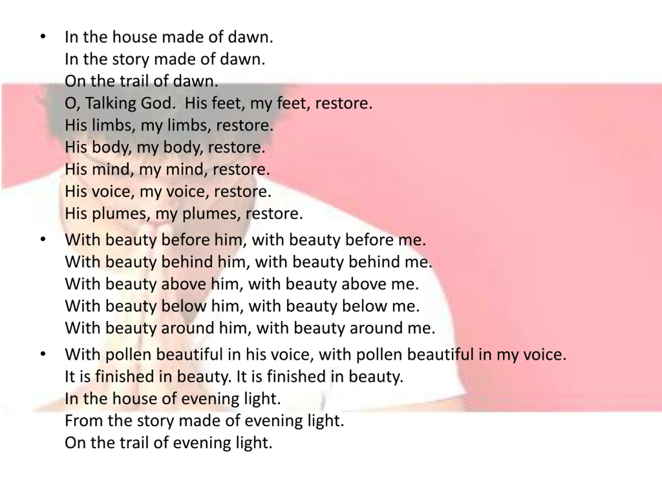 In the house made of dawn. In the story made of dawn. On the trail of dawn. O, Talking God. His feet, my feet, restore. His limbs, my limbs, restore. His body, my body, restore. His mind, my mind, restore. His voice, my voice, restore. His plumes, my plumes, restore. With beauty before him, with beauty before me. With beauty behind him, with beauty behind me. With beauty above him, with beauty above me. With beauty below him, with beauty below me. With beauty around him, with beauty around me. With pollen beautiful in his voice, with pollen beautiful in my voice. It is finished in beauty. It is finished in beauty. In the house of evening light. From the story made of evening light. On the trail of evening light.