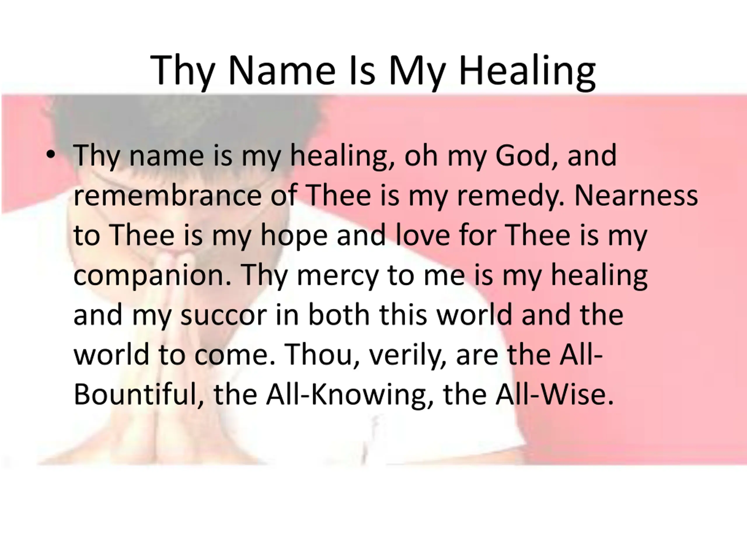 Thy Name Is My Healing Thy name is my healing, oh my God, and remembrance of Thee is my remedy. Nearness to Thee is my hope and love for Thee is my companion. Thy mercy to me is my healing and my succor in both this world and the world to come. Thou, verily, are the All- Bountiful, the All-Knowing, the All-Wise.