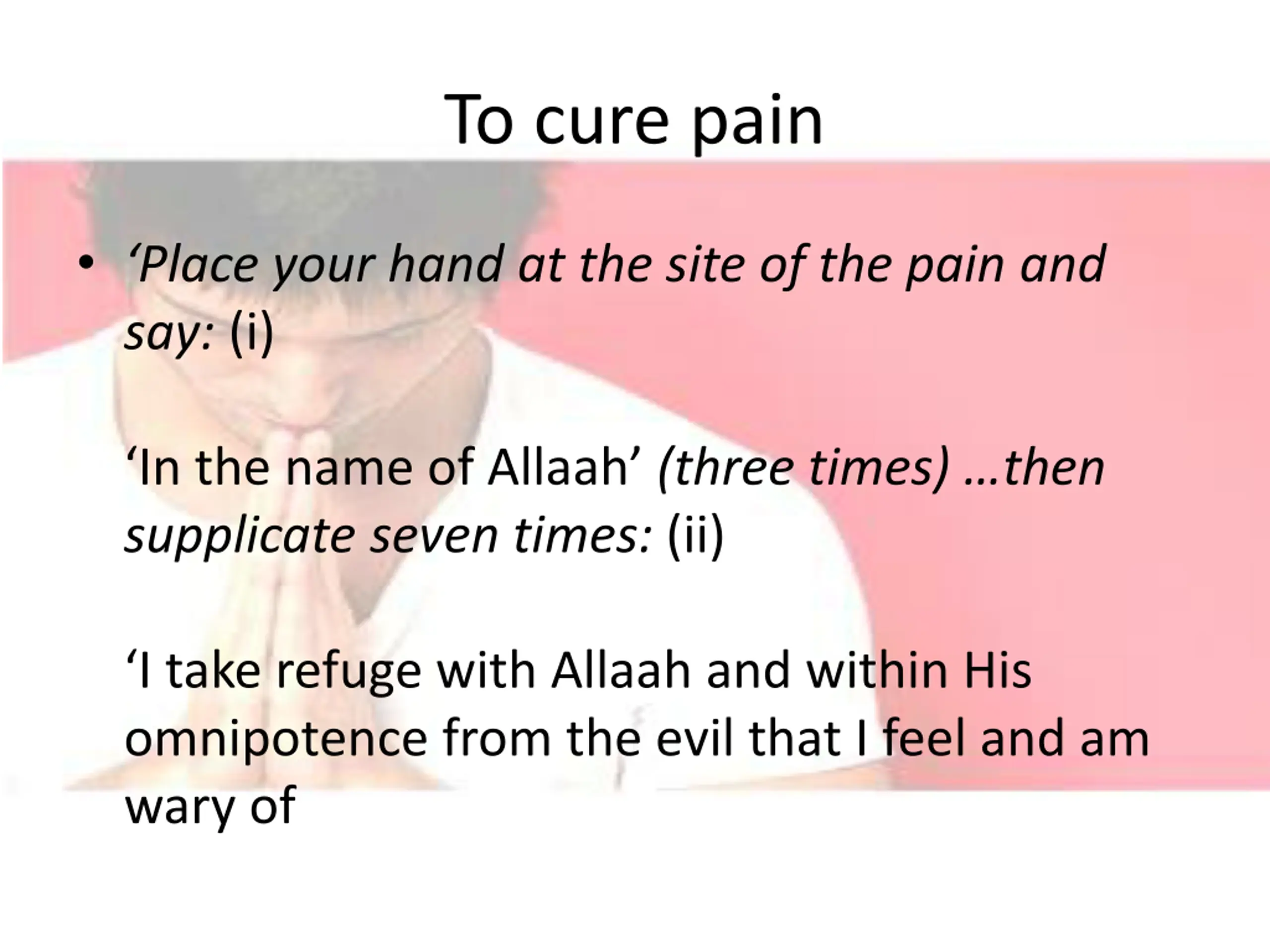 To cure pain Place your hand at the site of the pain and say: (i) In the name of Allaah (three times) then supplicate seven times: (ii) I take refuge with Allaah and within His omnipotence from the evil that I feel and am wary of