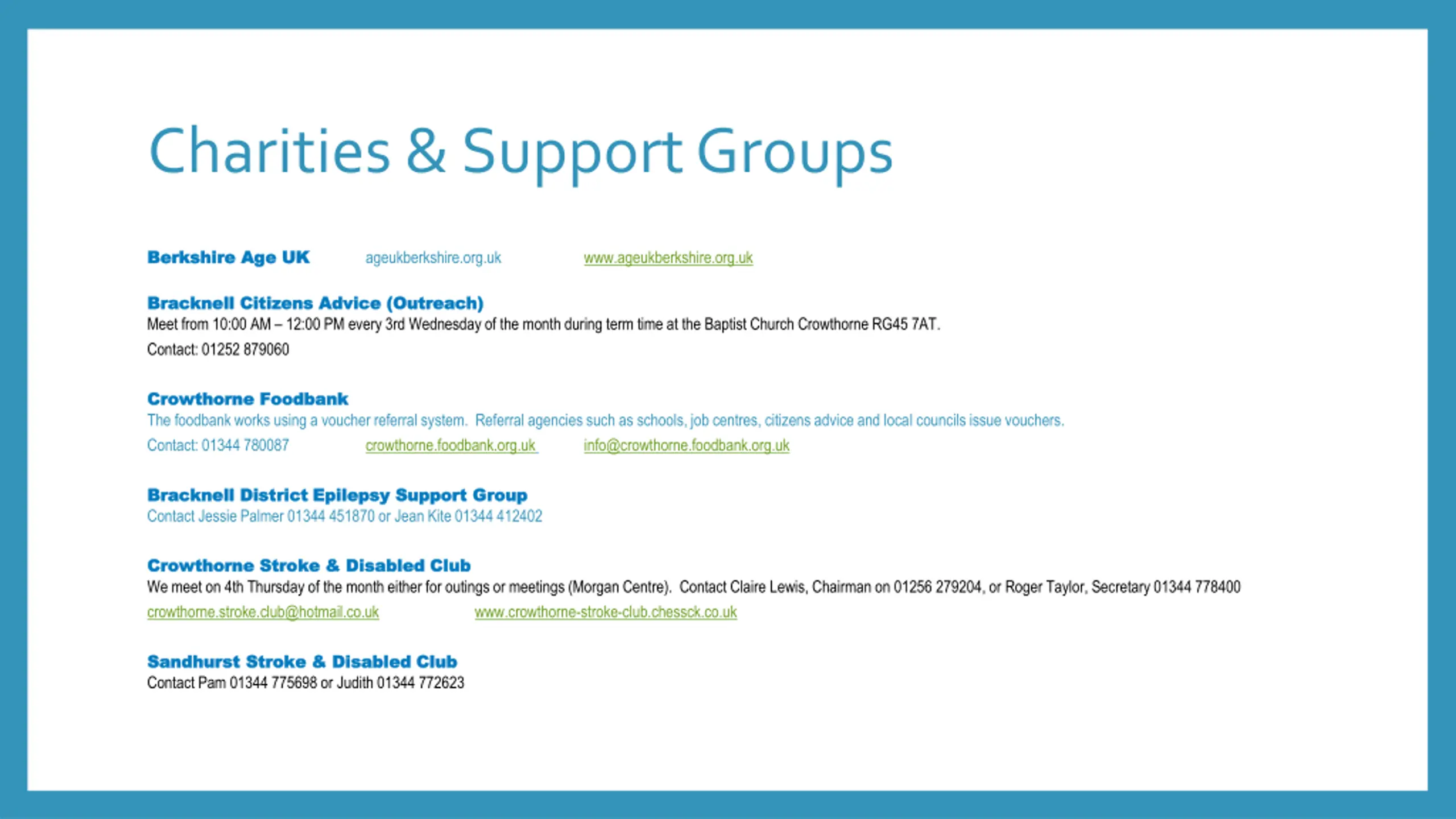 Charities & Support Groups Berkshire Age UK Berkshire Age UK ageukberkshire.org.uk www.ageukberkshire.org.uk Bracknell Citizens Advice (Outreach) Bracknell Citizens Advice (Outreach) Meet from 10:00 AM 12:00 PM every 3rd Wednesday of the month during term time at the Baptist Church Crowthorne RG45 7AT. Contact: 01252 879060 Crowthorne Foodbank Crowthorne Foodbank The foodbank works using a voucher referral system. Referral agencies such as schools, job centres, citizens advice and local councils issue vouchers. Contact: 01344 780087 crowthorne.foodbank.org.uk info@crowthorne.foodbank.org.uk Bracknell District Epilepsy Support Group Bracknell District Epilepsy Support Group Contact Jessie Palmer 01344 451870 or Jean Kite 01344 412402 Crowthorne Stroke & Disabled Club Crowthorne Stroke & Disabled Club We meet on 4th Thursday of the month either for outings or meetings (Morgan Centre). Contact Claire Lewis, Chairman on 01256 279204, or Roger Taylor, Secretary 01344 778400 crowthorne.stroke.club@hotmail.co.uk www.crowthorne-stroke-club.chessck.co.uk Sandhurst Stroke & Disabled Club Sandhurst Stroke & Disabled Club Contact Pam 01344 775698 or Judith 01344 772623