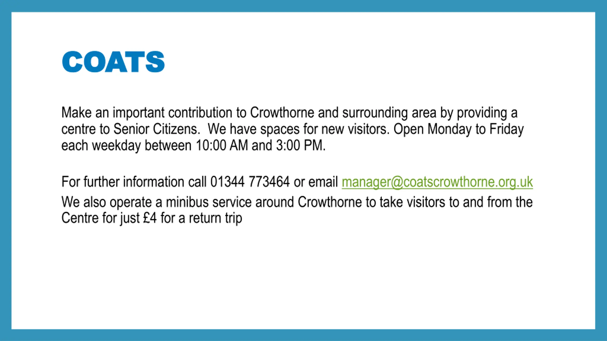 COATS COATS Make an important contribution to Crowthorne and surrounding area by providing a centre to Senior Citizens. We have spaces for new visitors. Open Monday to Friday each weekday between 10:00 AM and 3:00 PM. For further information call 01344 773464 or email manager@coatscrowthorne.org.uk We also operate a minibus service around Crowthorne to take visitors to and from the Centre for just 4 for a return trip