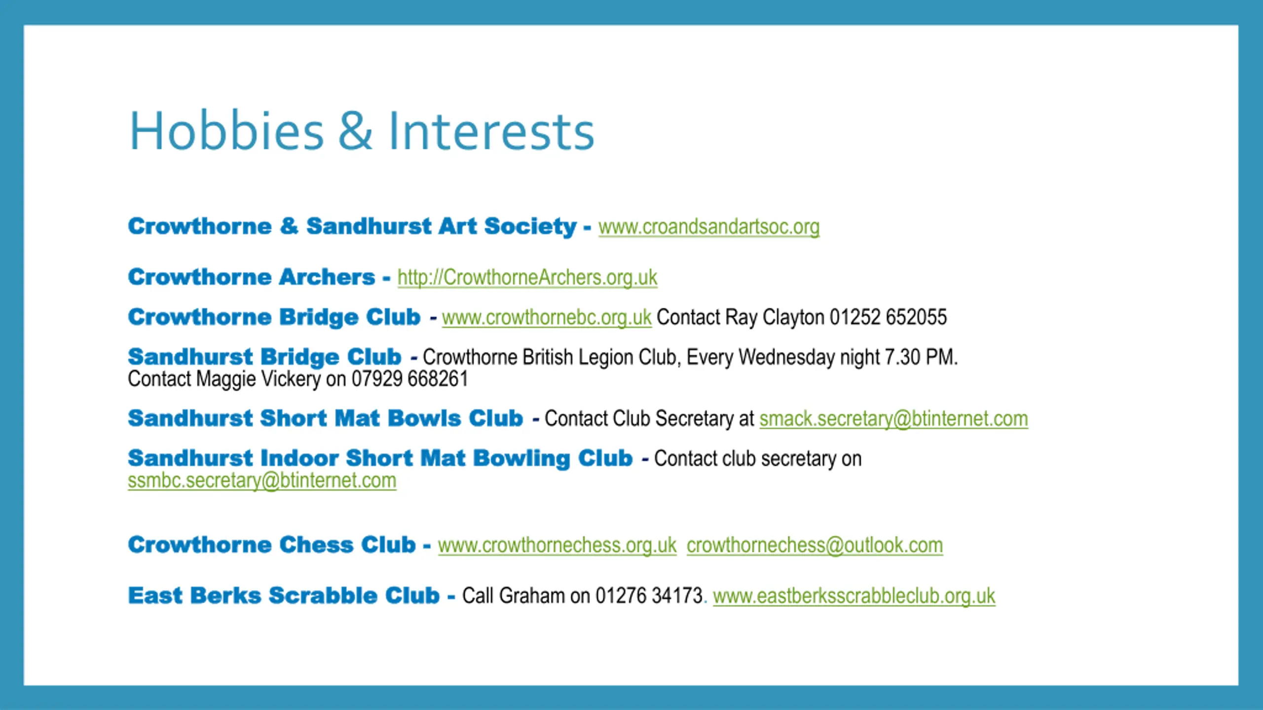 Hobbies & Interests Crowthorne & Sandhurst Art Society Crowthorne & Sandhurst Art Society - - www.croandsandartsoc.org Crowthorne Archers Crowthorne Archers - - http://CrowthorneArchers.org.uk Crowthorne Bridge Club Crowthorne Bridge Club - www.crowthornebc.org.uk Contact Ray Clayton 01252 652055 Sandhurst Bridge Club Sandhurst Bridge Club - Crowthorne British Legion Club, Every Wednesday night 7.30 PM. Contact Maggie Vickery on 07929 668261 Sandhurst Short Mat Bowls Club Sandhurst Short Mat Bowls Club - Contact Club Secretary at smack.secretary@btinternet.com Sandhurst Indoor Short Mat Bowling Club Sandhurst Indoor Short Mat Bowling Club - Contact club secretary on ssmbc.secretary@btinternet.com Crowthorne Chess Club Crowthorne Chess Club - - www.crowthornechess.org.uk crowthornechess@outlook.com East Berks Scrabble Club East Berks Scrabble Club - - Call Graham on 01276 34173. www.eastberksscrabbleclub.org.uk
