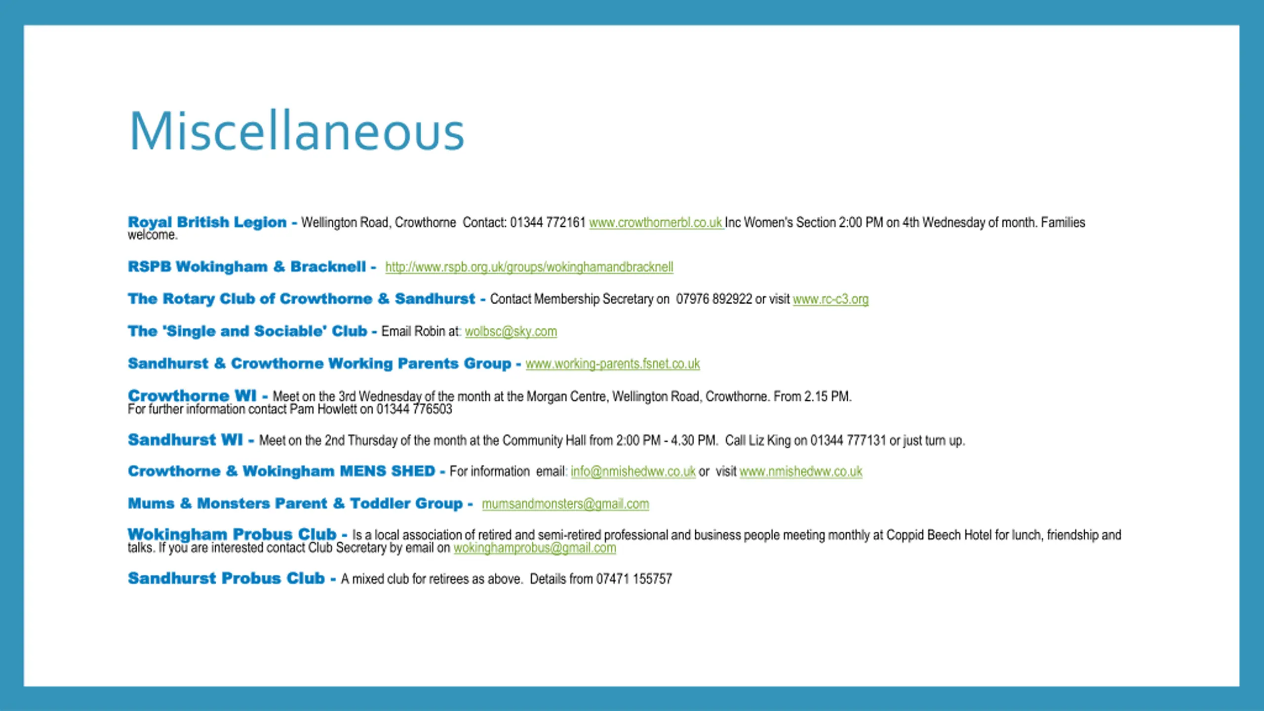 Miscellaneous Royal British Legion Royal British Legion - - Wellington Road, Crowthorne Contact: 01344 772161 www.crowthornerbl.co.ukInc Women's Section 2:00 PM on 4th Wednesday of month. Families welcome. RSPB Wokingham & Bracknell RSPB Wokingham & Bracknell - - http://www.rspb.org.uk/groups/wokinghamandbracknell The Rotary Club of Crowthorne & Sandhurst The Rotary Club of Crowthorne & Sandhurst - - Contact Membership Secretary on 07976 892922 or visit www.rc-c3.org The 'Single and Sociable' Club The 'Single and Sociable' Club - - Email Robin at: wolbsc@sky.com Sandhurst & Crowthorne Working Parents Group Sandhurst & Crowthorne Working Parents Group - - www.working-parents.fsnet.co.uk Crowthorne WI Crowthorne WI - - Meet on the 3rd Wednesday of the month at the Morgan Centre, Wellington Road, Crowthorne. From 2.15 PM. For further information contact Pam Howlett on 01344 776503 Sandhurst WI Sandhurst WI - - Meet on the 2nd Thursday of the month at the Community Hall from 2:00 PM - 4.30 PM. Call Liz King on 01344 777131 or just turn up. Crowthorne & Wokingham MENS SHED Crowthorne & Wokingham MENS SHED - - For information email: info@nmishedww.co.uk or visit www.nmishedww.co.uk Mums & Monsters Parent & Toddler Group Mums & Monsters Parent & Toddler Group - - mumsandmonsters@gmail.com Wokingham Probus Club Wokingham Probus Club - - Is a local association of retired and semi-retired professional and business people meeting monthly at Coppid Beech Hotel for lunch, friendship and talks. If you are interested contact Club Secretary by email on wokinghamprobus@gmail.com Sandhurst Probus Club Sandhurst Probus Club - - A mixed club for retirees as above. Details from 07471 155757