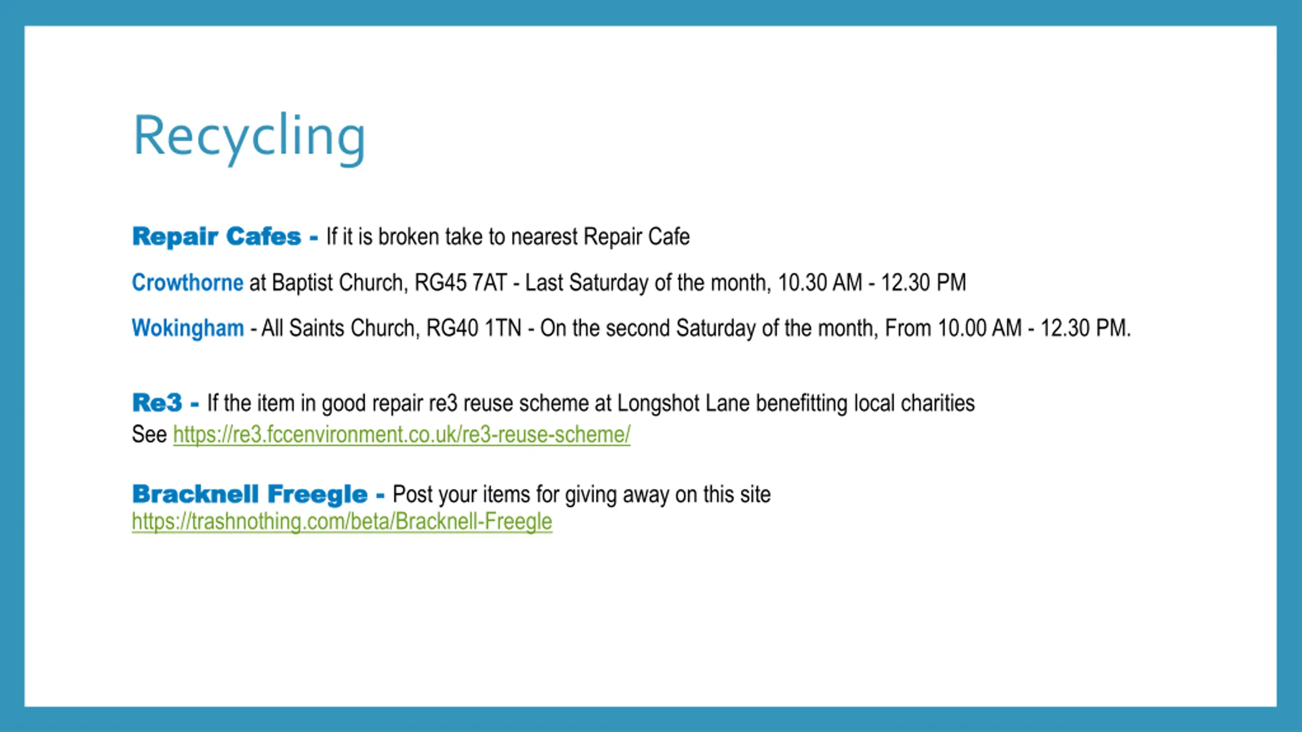 Recycling Repair Cafes Repair Cafes - - If it is broken take to nearest Repair Cafe Crowthorne at Baptist Church, RG45 7AT - Last Saturday of the month, 10.30 AM - 12.30 PM Wokingham -All Saints Church, RG40 1TN - On the second Saturday of the month, From 10.00 AM - 12.30 PM. Re3 Re3 - - If the item in good repair re3 reuse scheme at Longshot Lane benefitting local charities See https://re3.fccenvironment.co.uk/re3-reuse-scheme/ Bracknell Bracknell Freegle https://trashnothing.com/beta/Bracknell-Freegle Freegle - - Post your items for giving away on this site
