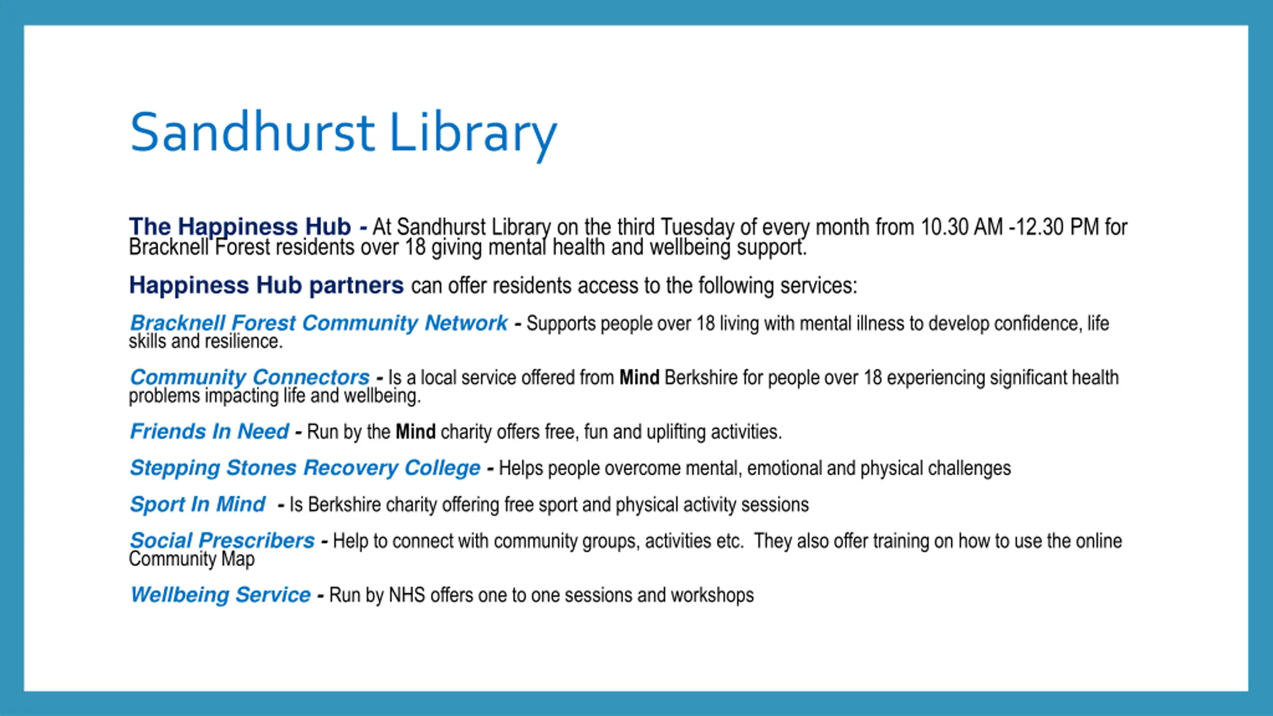 Sandhurst Library The Happiness Hub - At Sandhurst Library on the third Tuesday of every month from 10.30 AM -12.30 PM for Bracknell Forest residents over 18 giving mental health and wellbeing support. Happiness Hub partners can offer residents access to the following services: Bracknell Forest Community Network - Supports people over 18 living with mental illness to develop confidence, life skills and resilience. Community Connectors - Is a local service offered from Mind Berkshire for people over 18 experiencing significant health problems impacting life and wellbeing. Friends In Need - Run by the Mind charity offers free, fun and uplifting activities. Stepping Stones Recovery College - Helps people overcome mental, emotional and physical challenges Sport In Mind - Is Berkshire charity offering free sport and physical activity sessions Social Prescribers - Help to connect with community groups, activities etc. They also offer training on how to use the online Community Map Wellbeing Service - Run by NHS offers one to one sessions and workshops