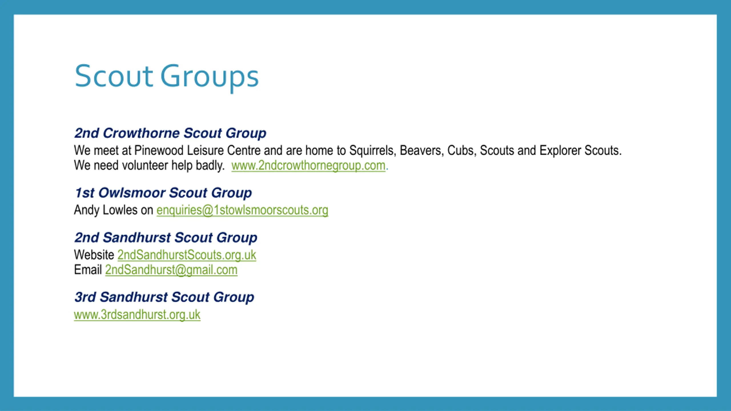 Scout Groups 2nd Crowthorne Scout Group We meet at Pinewood Leisure Centre and are home to Squirrels, Beavers, Cubs, Scouts and Explorer Scouts. We need volunteer help badly. www.2ndcrowthornegroup.com. 1st Owlsmoor Scout Group Andy Lowles on enquiries@1stowlsmoorscouts.org 2nd Sandhurst Scout Group Website 2ndSandhurstScouts.org.uk Email 2ndSandhurst@gmail.com 3rd Sandhurst Scout Group www.3rdsandhurst.org.uk