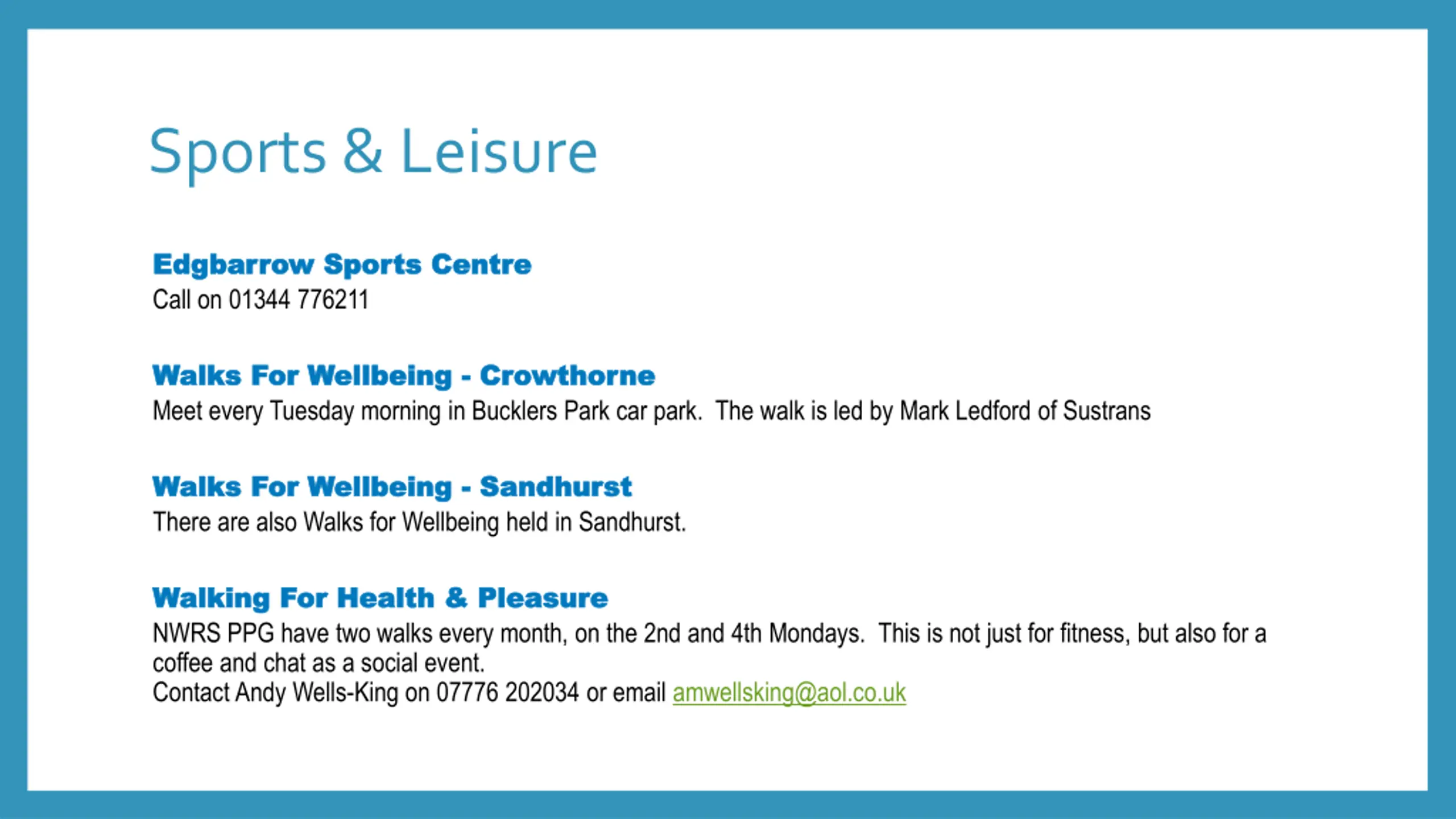 Sports & Leisure Edgbarrow Sports Centre Edgbarrow Sports Centre Call on 01344 776211 Walks For Wellbeing Walks For Wellbeing - - Crowthorne Meet every Tuesday morning in Bucklers Park car park. The walk is led by Mark Ledford of Sustrans Crowthorne Walks For Wellbeing Walks For Wellbeing - - Sandhurst There are also Walks for Wellbeing held in Sandhurst. Sandhurst Walking For Health & Pleasure Walking For Health & Pleasure NWRS PPG have two walks every month, on the 2nd and 4th Mondays. This is not just for fitness, but also for a coffee and chat as a social event. Contact Andy Wells-King on 07776 202034 or email amwellsking@aol.co.uk