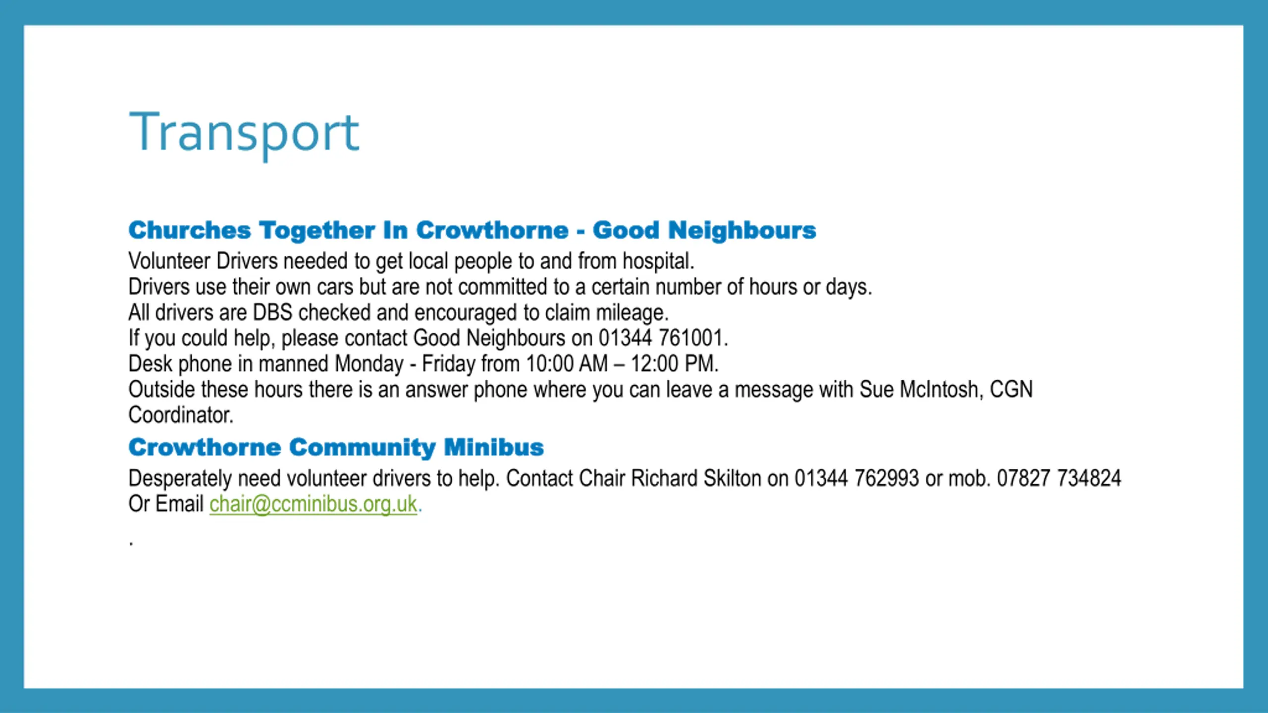 Transport Churches Together In Crowthorne Churches Together In Crowthorne - - Good Neighbours Volunteer Drivers needed to get local people to and from hospital. Drivers use their own cars but are not committed to a certain number of hours or days. All drivers are DBS checked and encouraged to claim mileage. If you could help, please contact Good Neighbours on 01344 761001. Desk phone in manned Monday - Friday from 10:00 AM 12:00 PM. Outside these hours there is an answer phone where you can leave a message with Sue McIntosh, CGN Coordinator. Crowthorne Community Minibus Crowthorne Community Minibus Desperately need volunteer drivers to help. Contact Chair Richard Skilton on 01344 762993 or mob. 07827 734824 Or Email chair@ccminibus.org.uk. . Good Neighbours
