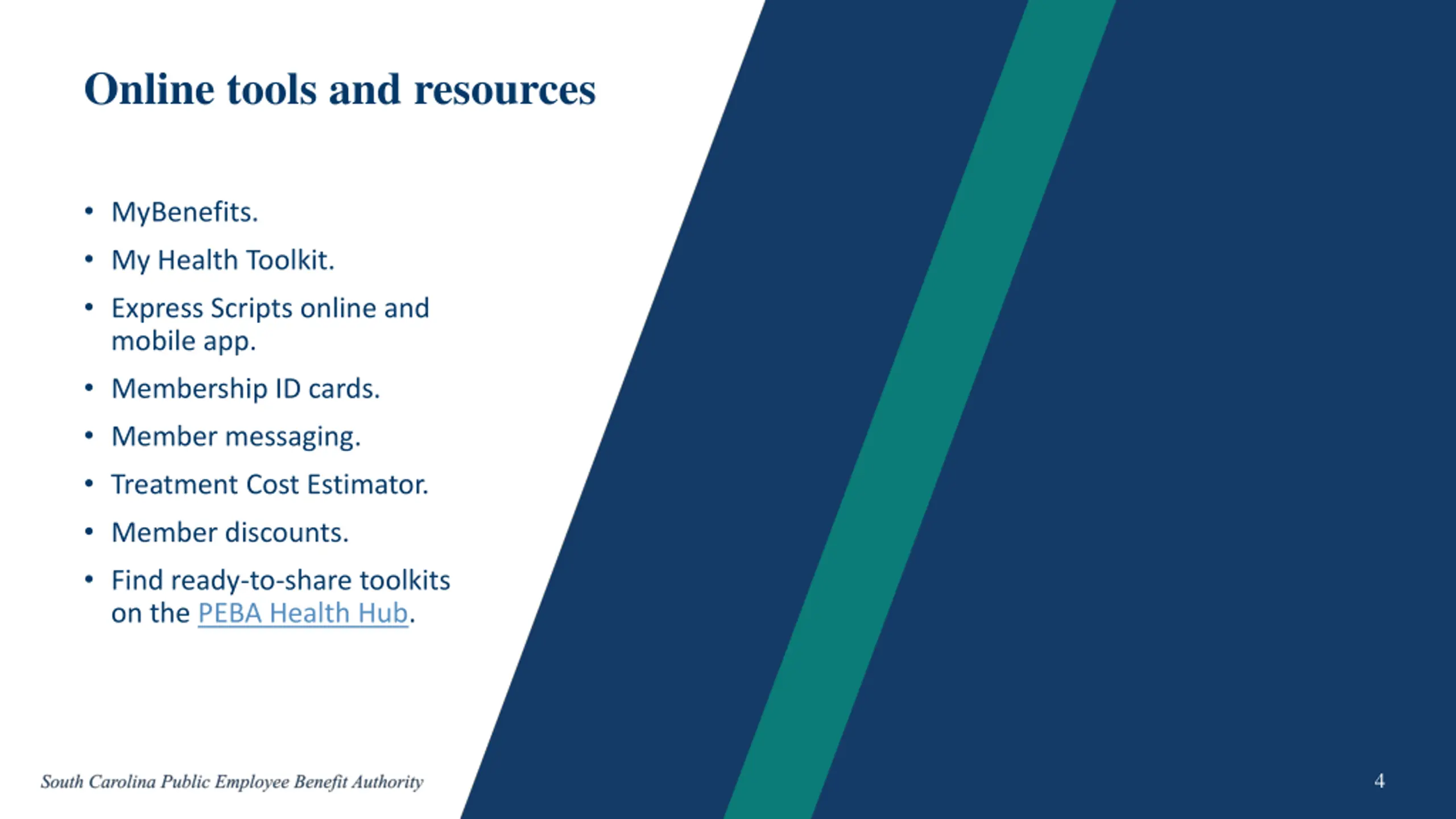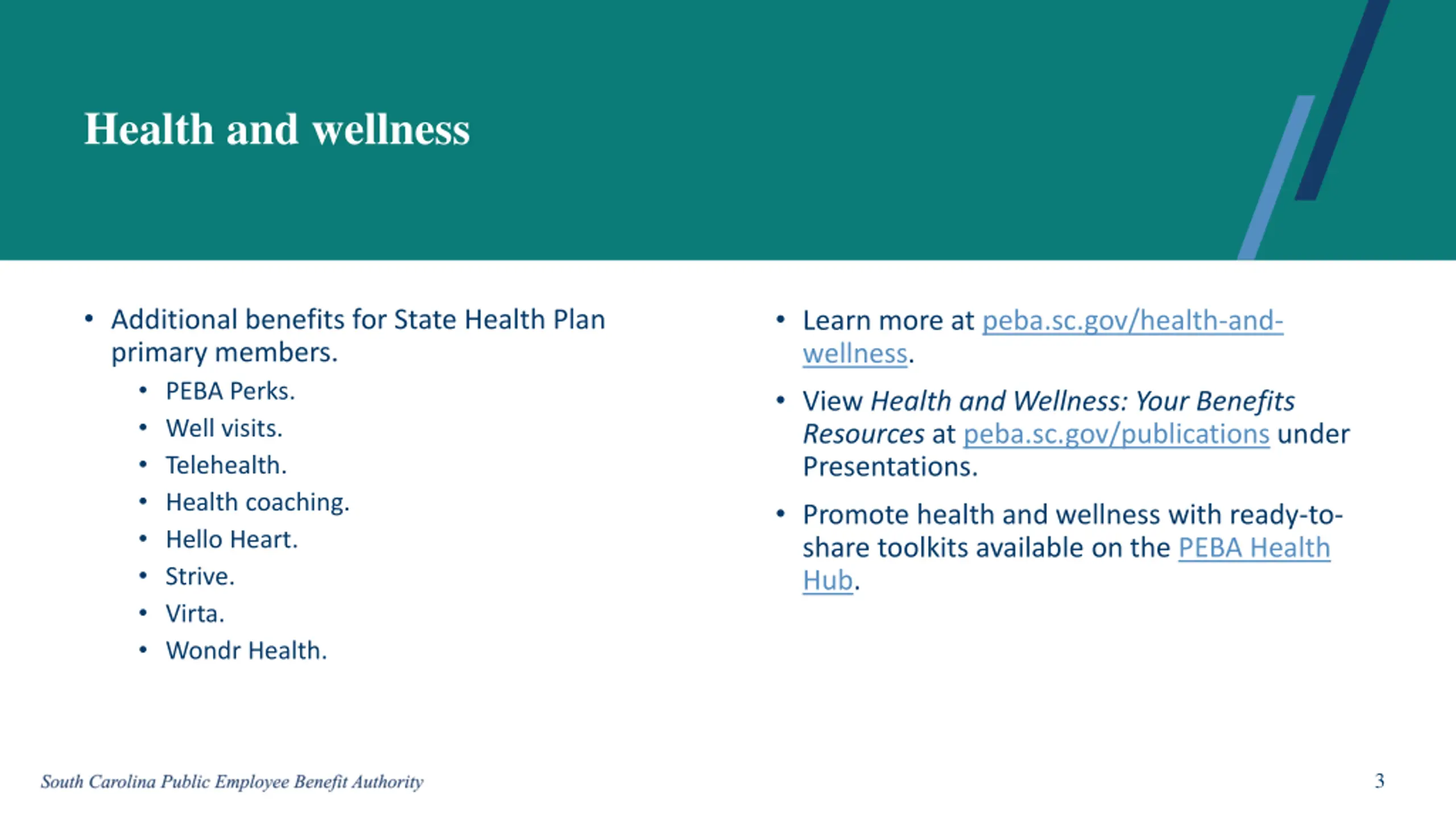 Health and wellness Additional benefits for State Health Plan primary members. PEBA Perks. Well visits. Telehealth. Health coaching. Hello Heart. Strive. Virta. Wondr Health. Learn more at peba.sc.gov/health-and- wellness. View Health and Wellness: Your Benefits Resources at peba.sc.gov/publications under Presentations. Promote health and wellness with ready-to- share toolkits available on the PEBA Health Hub. 3