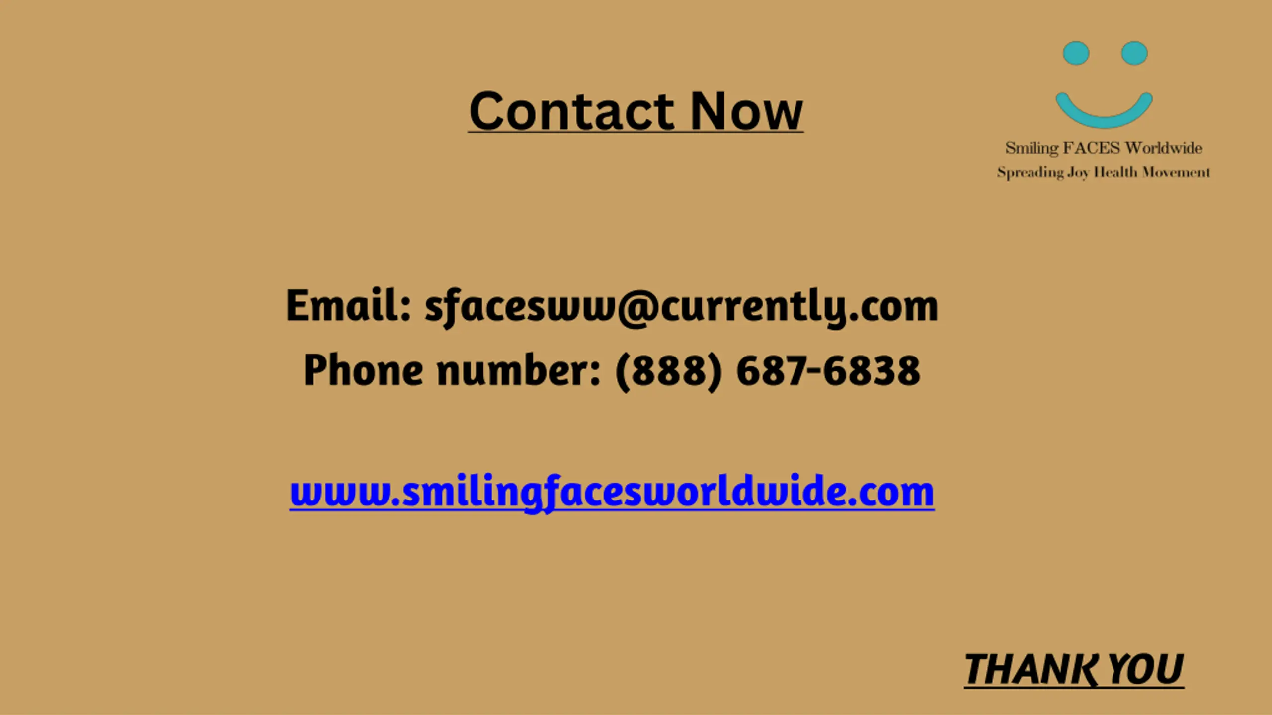 Contact Now Email: sfacesww@currently.com Phone number: (888) 687-6838 www.smilingfacesworldwide.com THANK YOU
