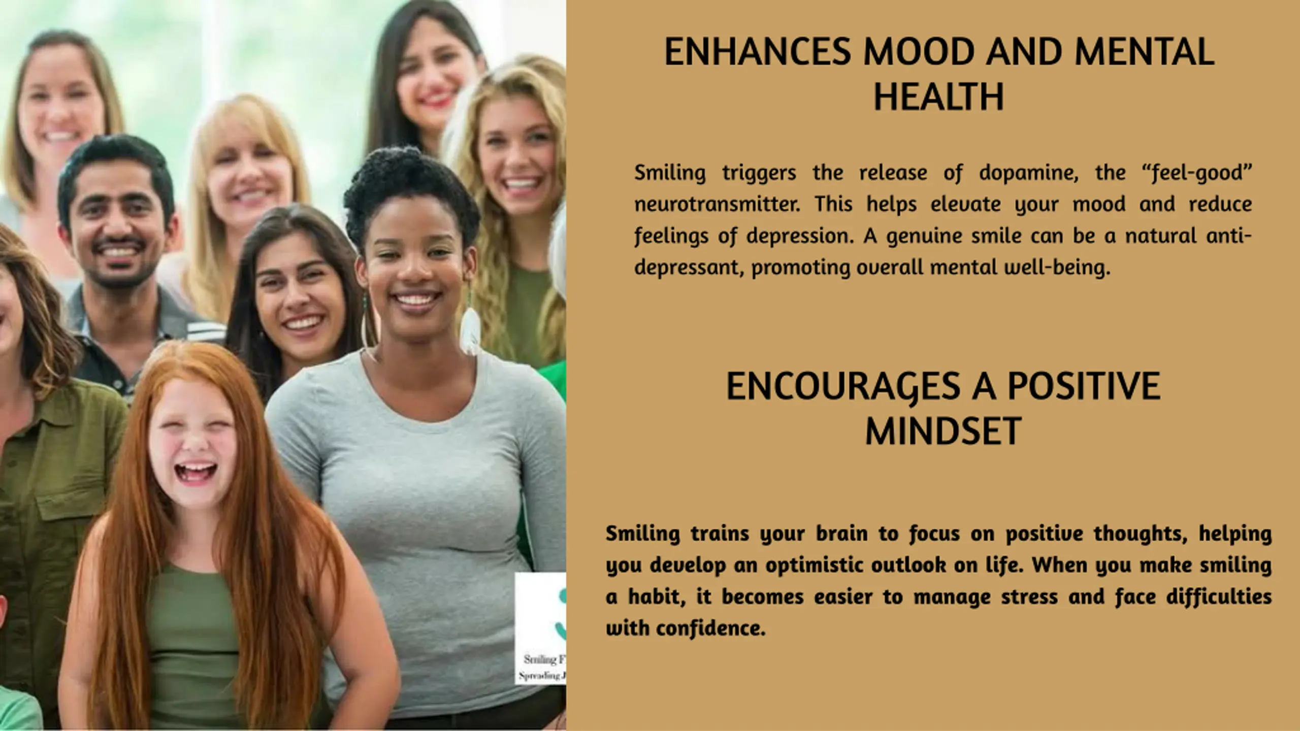 ENHANCES MOOD AND MENTAL HEALTH Smiling triggers the release of dopamine, the feel-good neurotransmitter. This helps elevate your mood and reduce feelings of depression. A genuine smile can be a natural anti- depressant, promoting overall mental well-being. ENCOURAGES A POSITIVE MINDSET Smiling trains your brain to focus on positive thoughts, helping you develop an optimistic outlook on life. When you make smiling a habit, it becomes easier to manage stress and face difficulties with confidence.