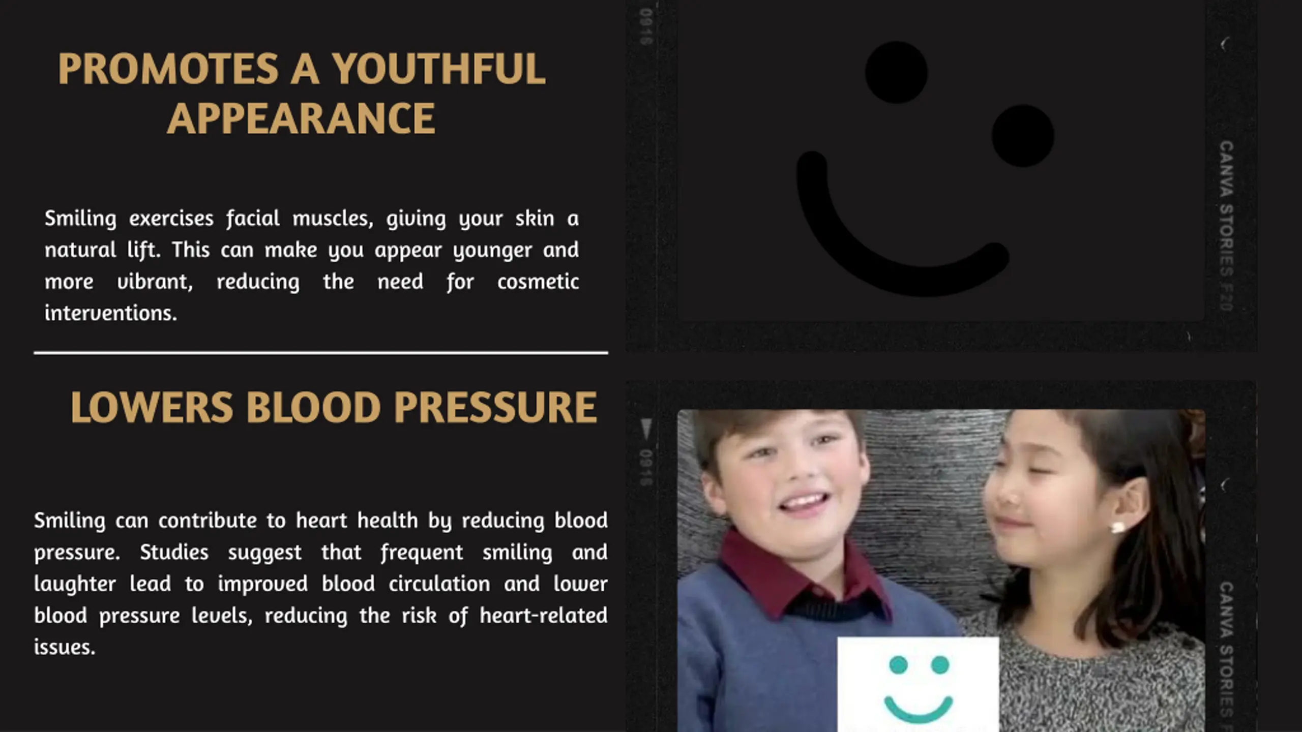 PROMOTES A YOUTHFUL APPEARANCE Smiling exercises facial muscles, giving your skin a natural lift. This can make you appear younger and more vibrant, reducing the need for cosmetic interventions. LOWERS BLOOD PRESSURE Smiling can contribute to heart health by reducing blood pressure. Studies suggest that frequent smiling and laughter lead to improved blood circulation and lower blood pressure levels, reducing the risk of heart-related issues.