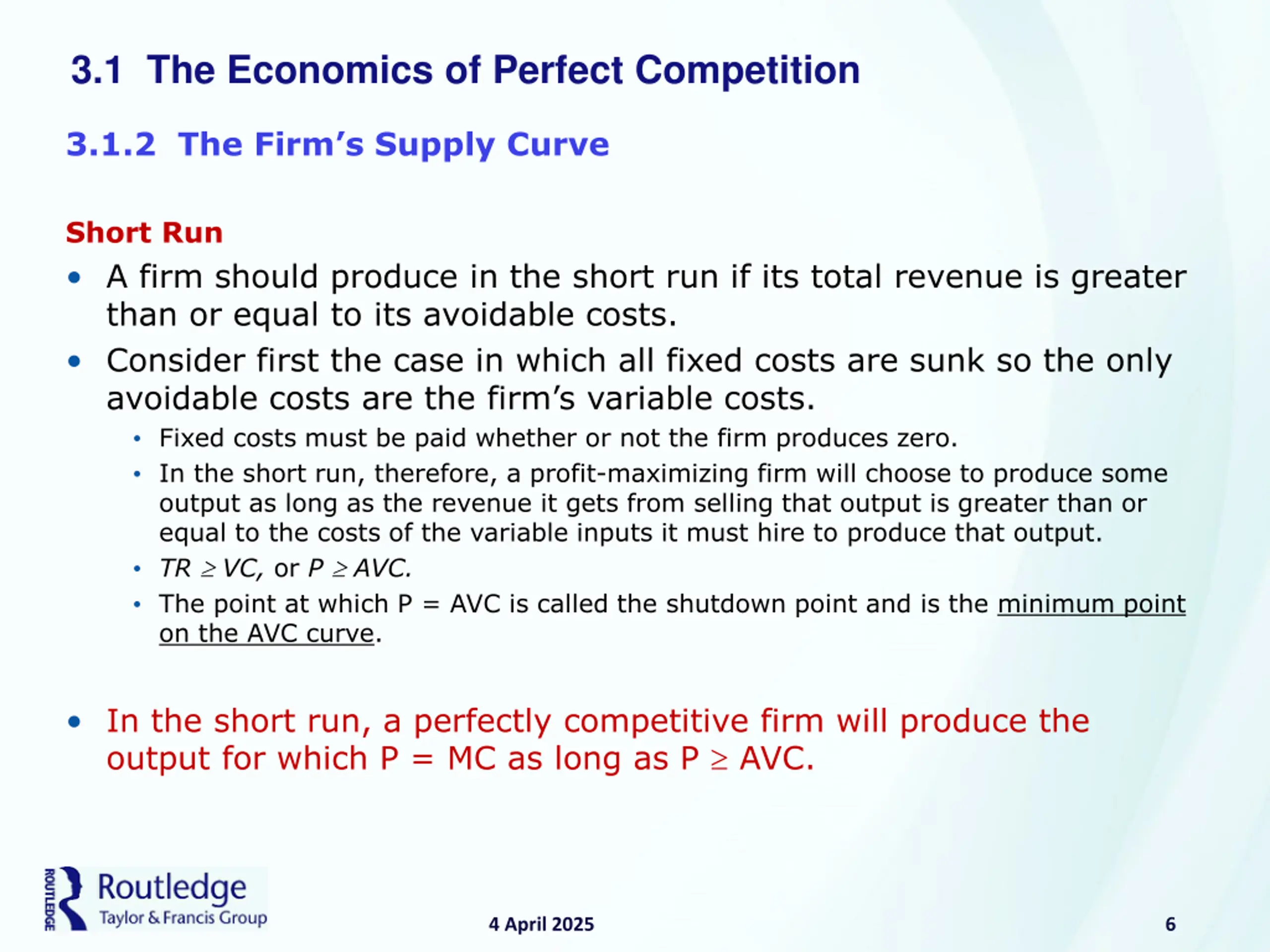 3.1 The Economics of Perfect Competition 3.1.2 The Firm s Supply Curve Short Run A firm should produce in the short run if its total revenue is greater than or equal to its avoidable costs. Consider first the case in which all fixed costs are sunk so the only avoidable costs are the firm s variable costs. Fixed costs must be paid whether or not the firm produces zero. In the short run, therefore, a profit-maximizing firm will choose to produce some output as long as the revenue it gets from selling that output is greater than or equal to the costs of the variable inputs it must hire to produce that output. TR VC, or P AVC. The point at which P = AVC is called the shutdown point and is the minimum point on the AVC curve. In the short run, a perfectly competitive firm will produce the output for which P = MC as long as P AVC. 4 April 2025 6