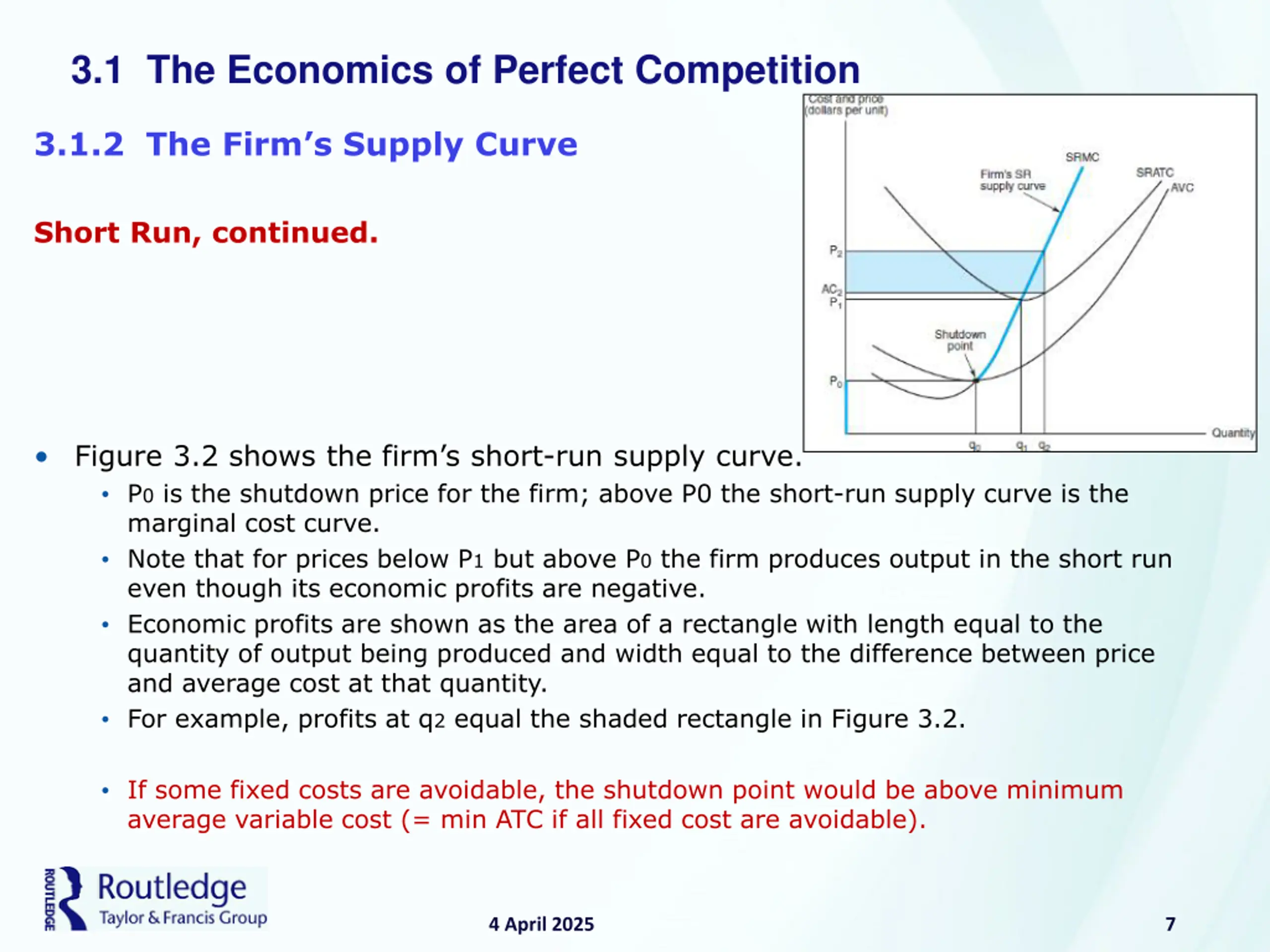 3.1 The Economics of Perfect Competition 3.1.2 The Firm s Supply Curve Short Run, continued. Figure 3.2 shows the firm s short-run supply curve. P0 is the shutdown price for the firm; above P0 the short-run supply curve is the marginal cost curve. Note that for prices below P1 but above P0 the firm produces output in the short run even though its economic profits are negative. Economic profits are shown as the area of a rectangle with length equal to the quantity of output being produced and width equal to the difference between price and average cost at that quantity. For example, profits at q2 equal the shaded rectangle in Figure 3.2. If some fixed costs are avoidable, the shutdown point would be above minimum average variable cost (= min ATC if all fixed cost are avoidable). 4 April 2025 7