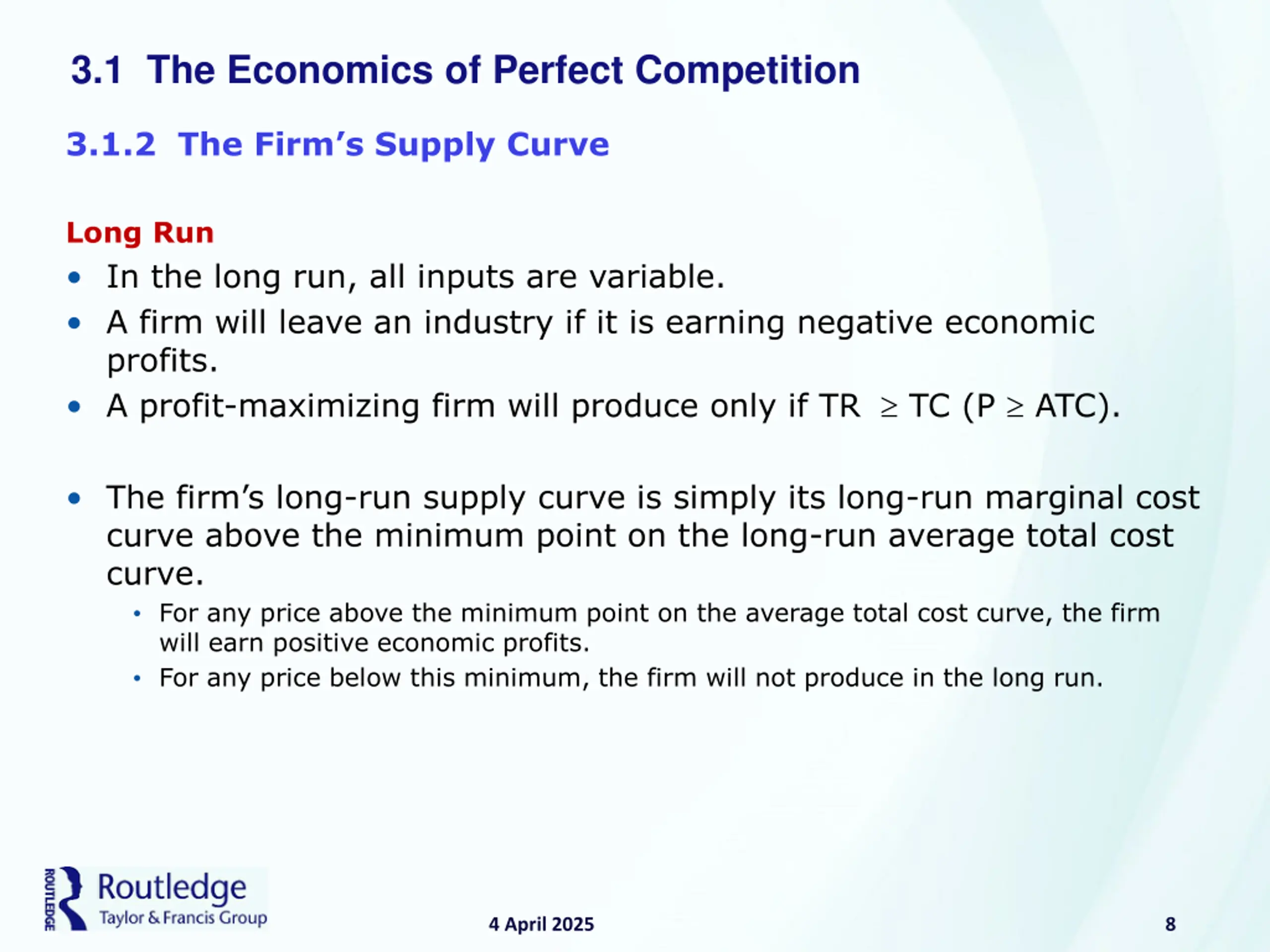 3.1 The Economics of Perfect Competition 3.1.2 The Firm s Supply Curve Long Run In the long run, all inputs are variable. A firm will leave an industry if it is earning negative economic profits. A profit-maximizing firm will produce only if TR TC (P ATC). The firm s long-run supply curve is simply its long-run marginal cost curve above the minimum point on the long-run average total cost curve. For any price above the minimum point on the average total cost curve, the firm will earn positive economic profits. For any price below this minimum, the firm will not produce in the long run. 4 April 2025 8